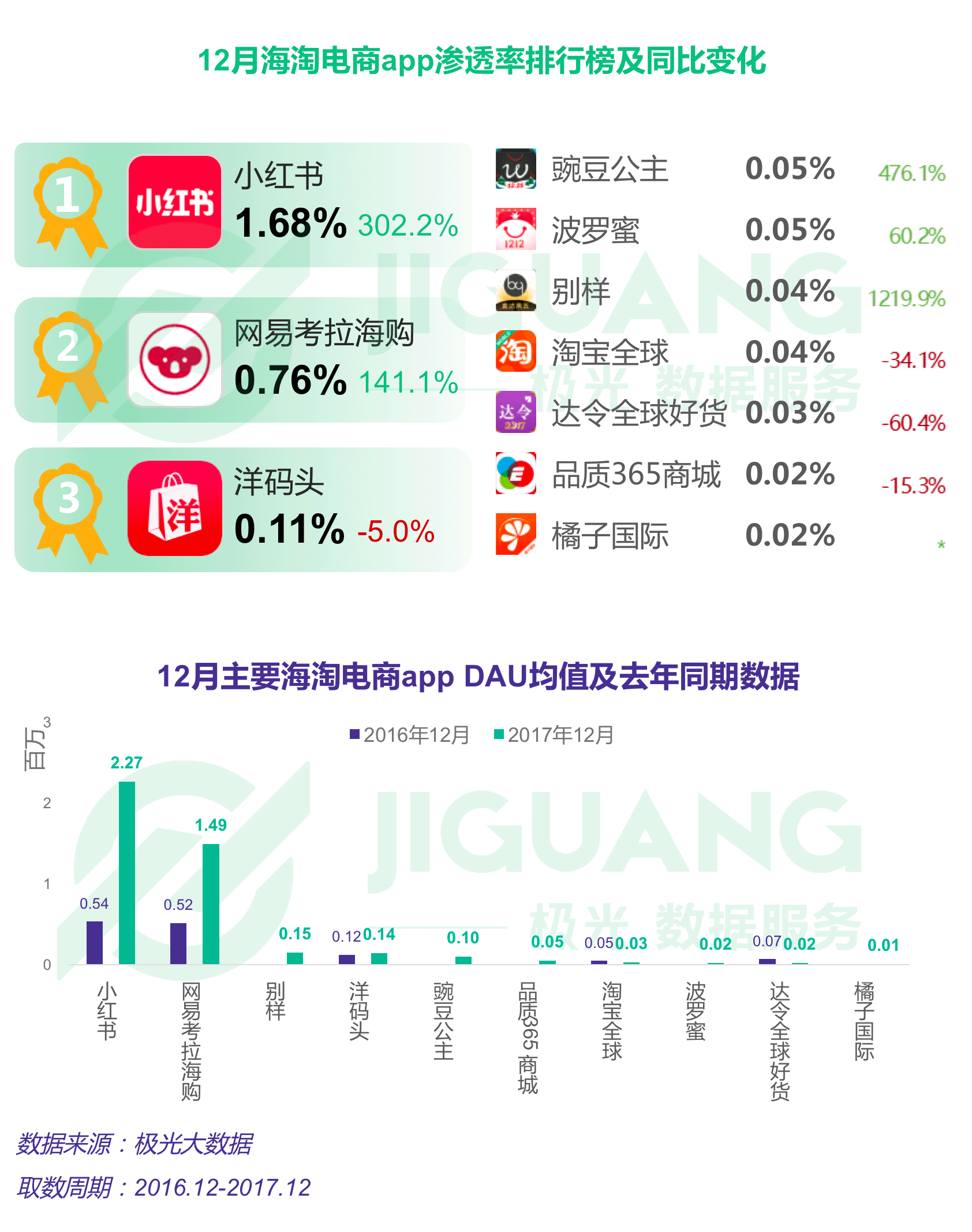- 小红书和网易考拉海购的12月DAU均值分别为227万和149万,是移动海淘电商中仅有的两款DAU量级在百万以上的app