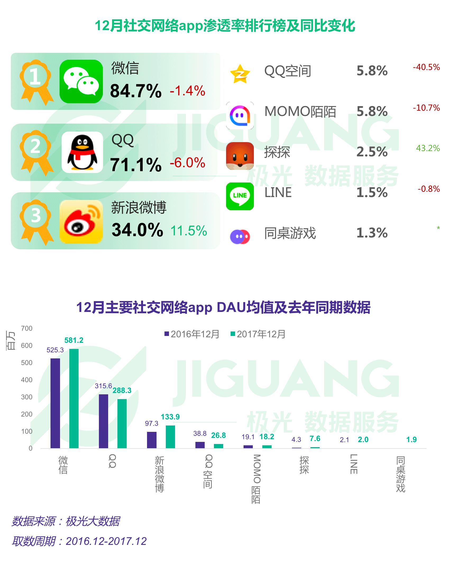 - 虽然老牌社交工具微信、QQ、新浪微博的市场渗透率及DAU在社交网络app中仍然领先,但新型社交玩法,如以休闲游戏交友为主的同桌游戏也能脱颖而出,社交游戏在未来或将成为一种新趋势