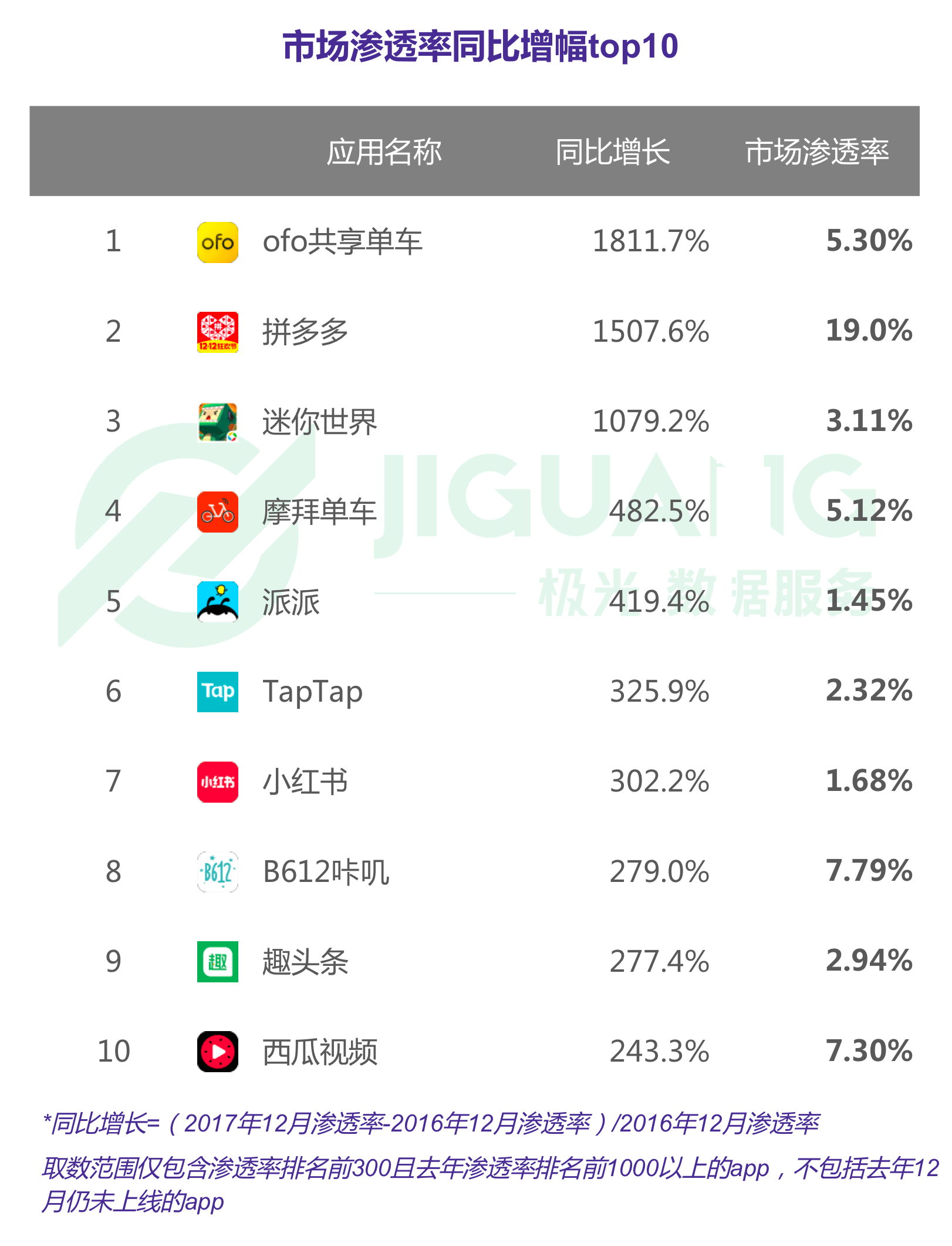 - ofo共享单车、拼多多和迷你世界过去一年市场渗透率同比增长均达到了1000%以上