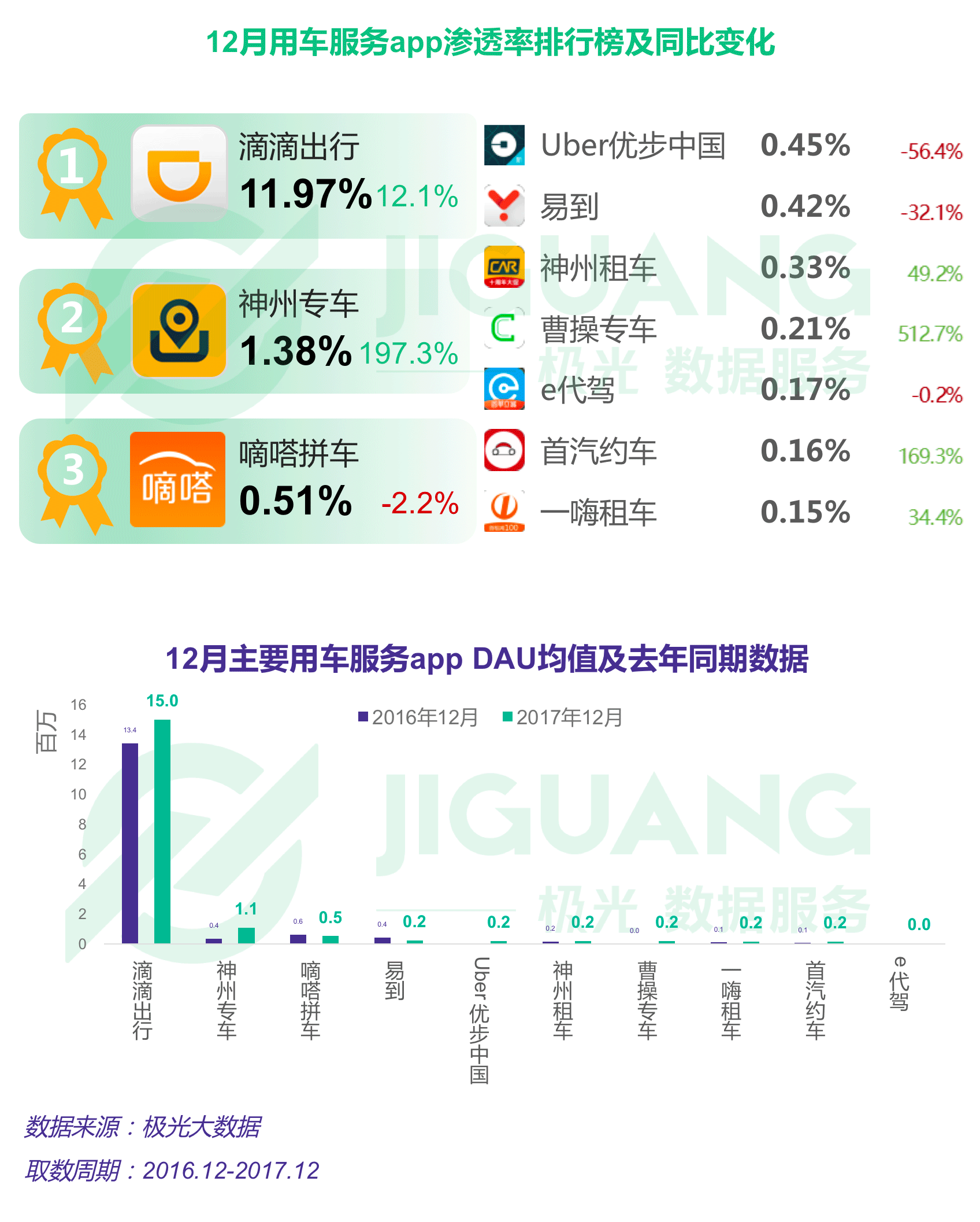 - 根据极光大数据统计,滴滴出行的市场渗透率为11.97%,DAU均值超过1500万,意味着每100个中国移动网民中就有接近12个人安装了滴滴出行,每天有超过1500万人使用了它