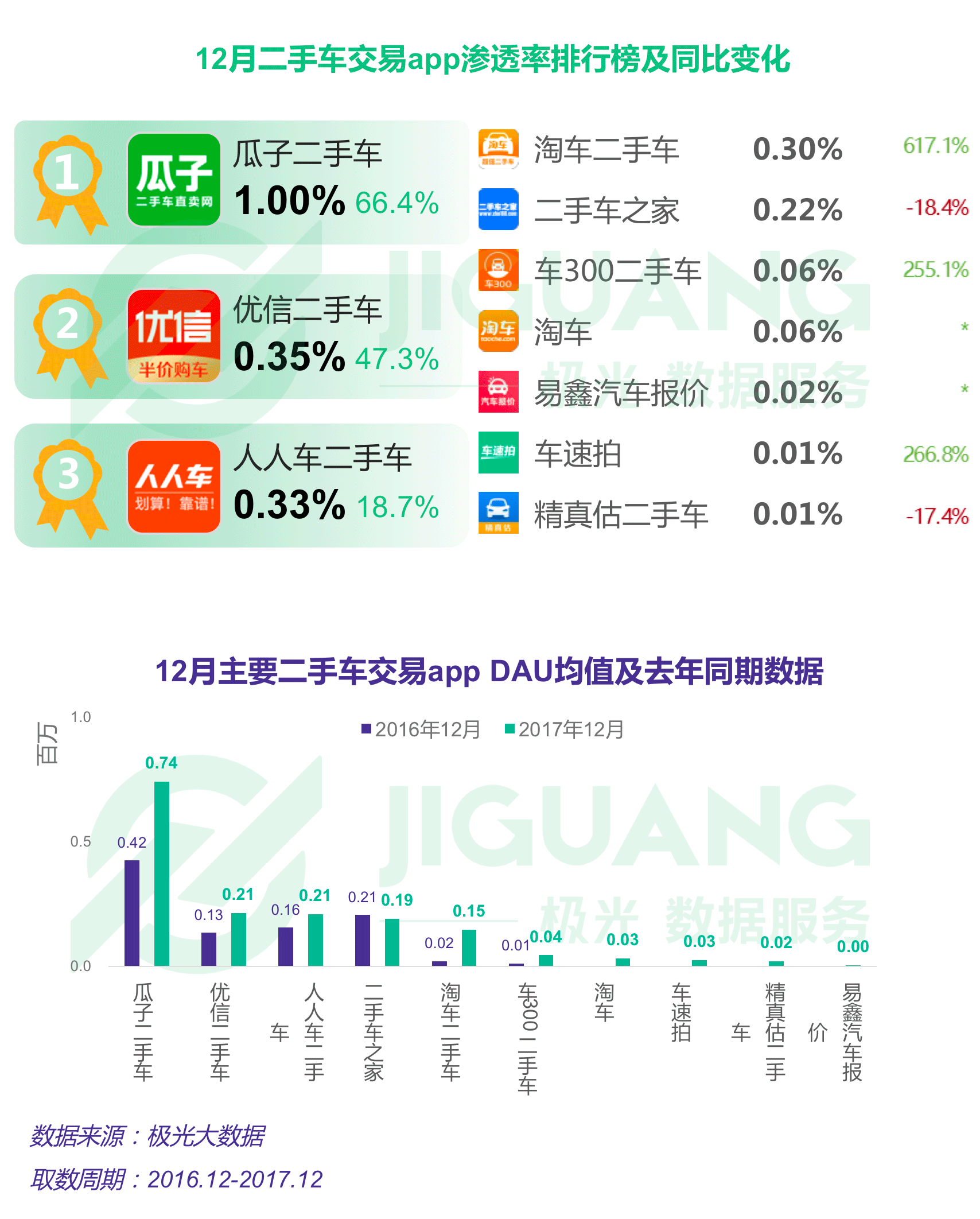 - 在移动二手车交易市场中名列渗透率前三甲的app分别是瓜子二手车、优信二手车和人人二手车,它们的市场渗透率分别为1.00%、0.35%和0.33%,其中优信二手车、人人二手车的市场渗透率和12月DAU均值都非常接近