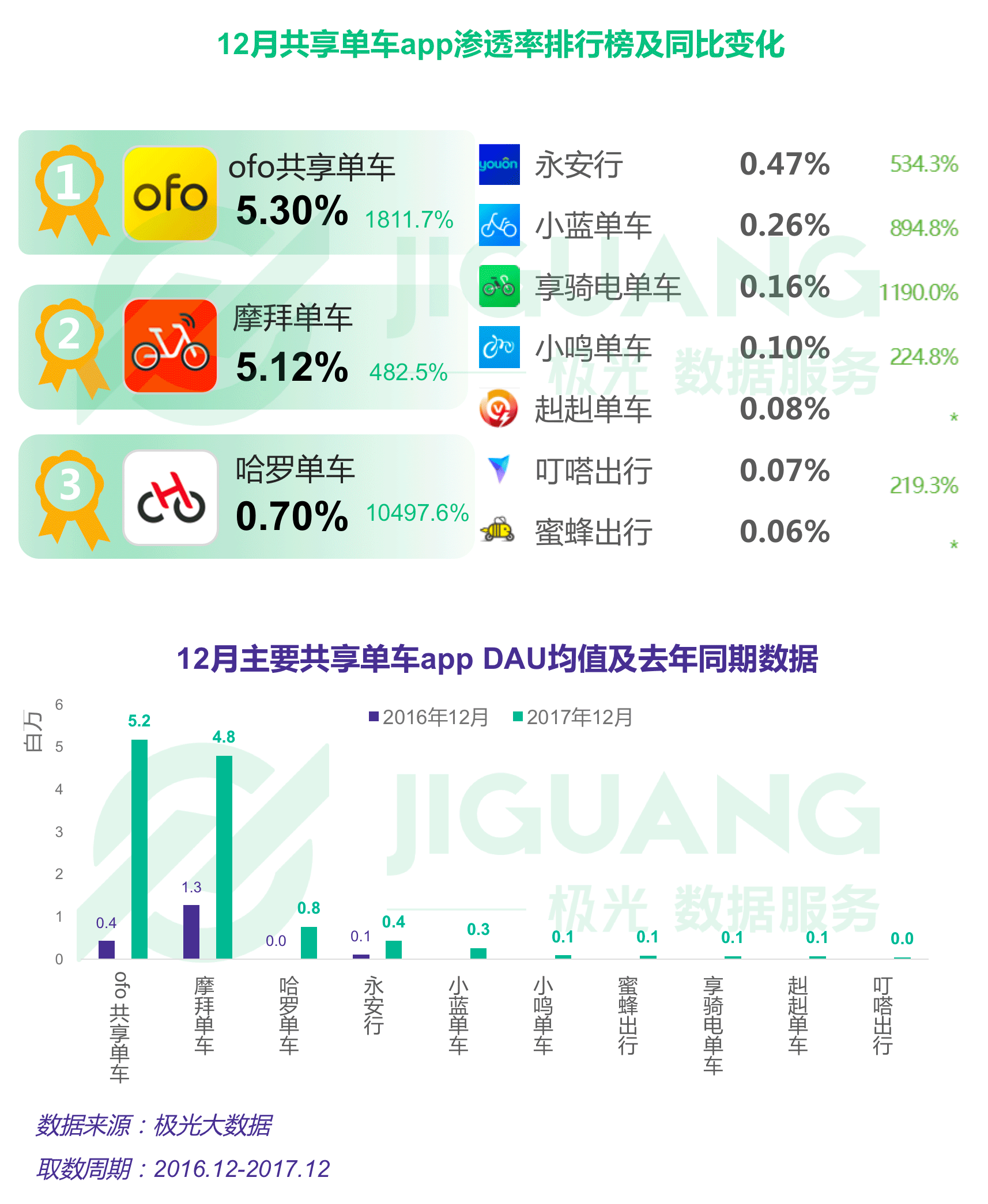 - ofo共享单车和摩拜单车的市场渗透率分别为5.30%和5.12%,12月DAU均值分别超过520万和480万