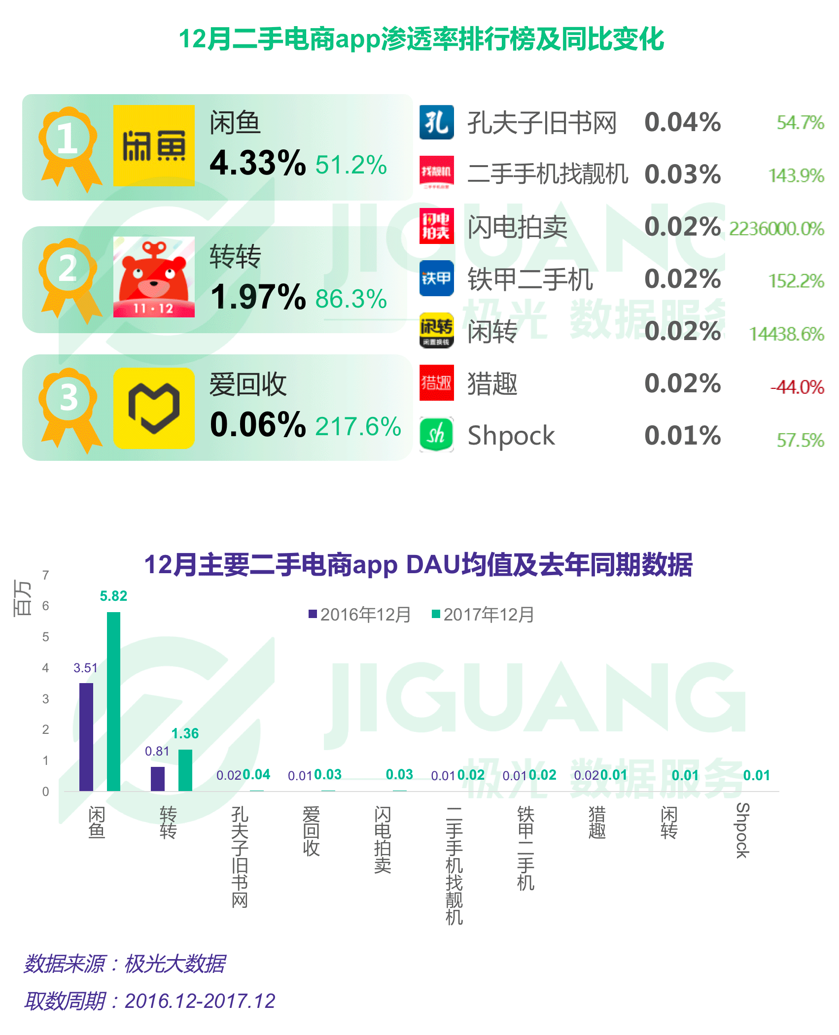 - 闲鱼的市场渗透率和DAU在二手电商app中处于非常领先的水平,截至2017年12月最后一周,它的渗透率为4.33%,DAU均值超过582万
