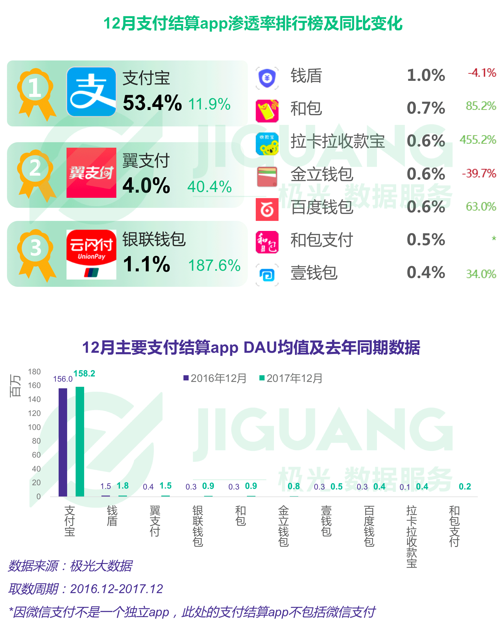 - 支付宝无疑是支付结算类app中的佼佼者,超过一半的中国移动网民安装了支付宝,但其增速已明显放缓,只有11.9%,12月DAU均值超过1.5亿人