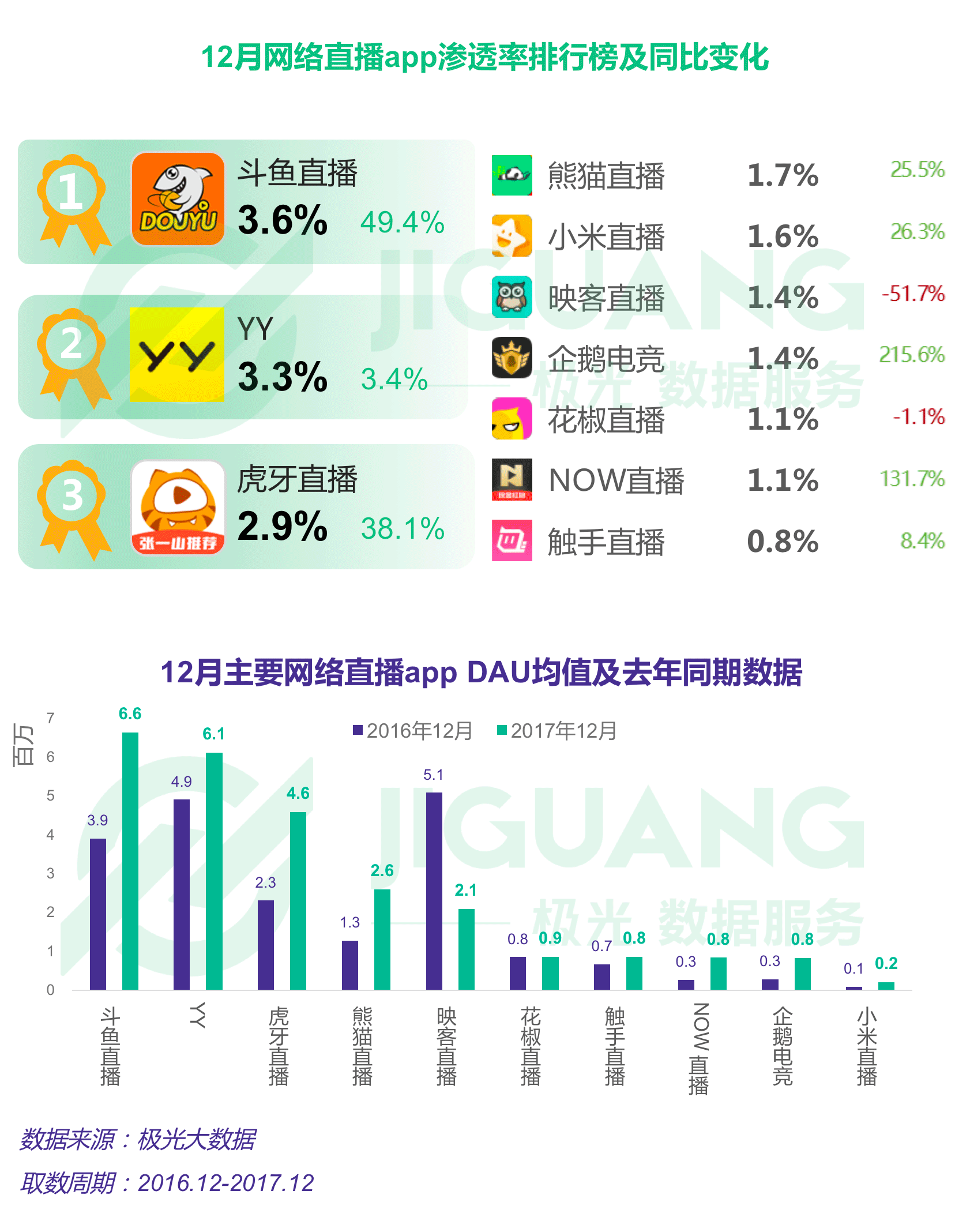 - 斗鱼直播和YY的12月DAU均值都超过了600万人