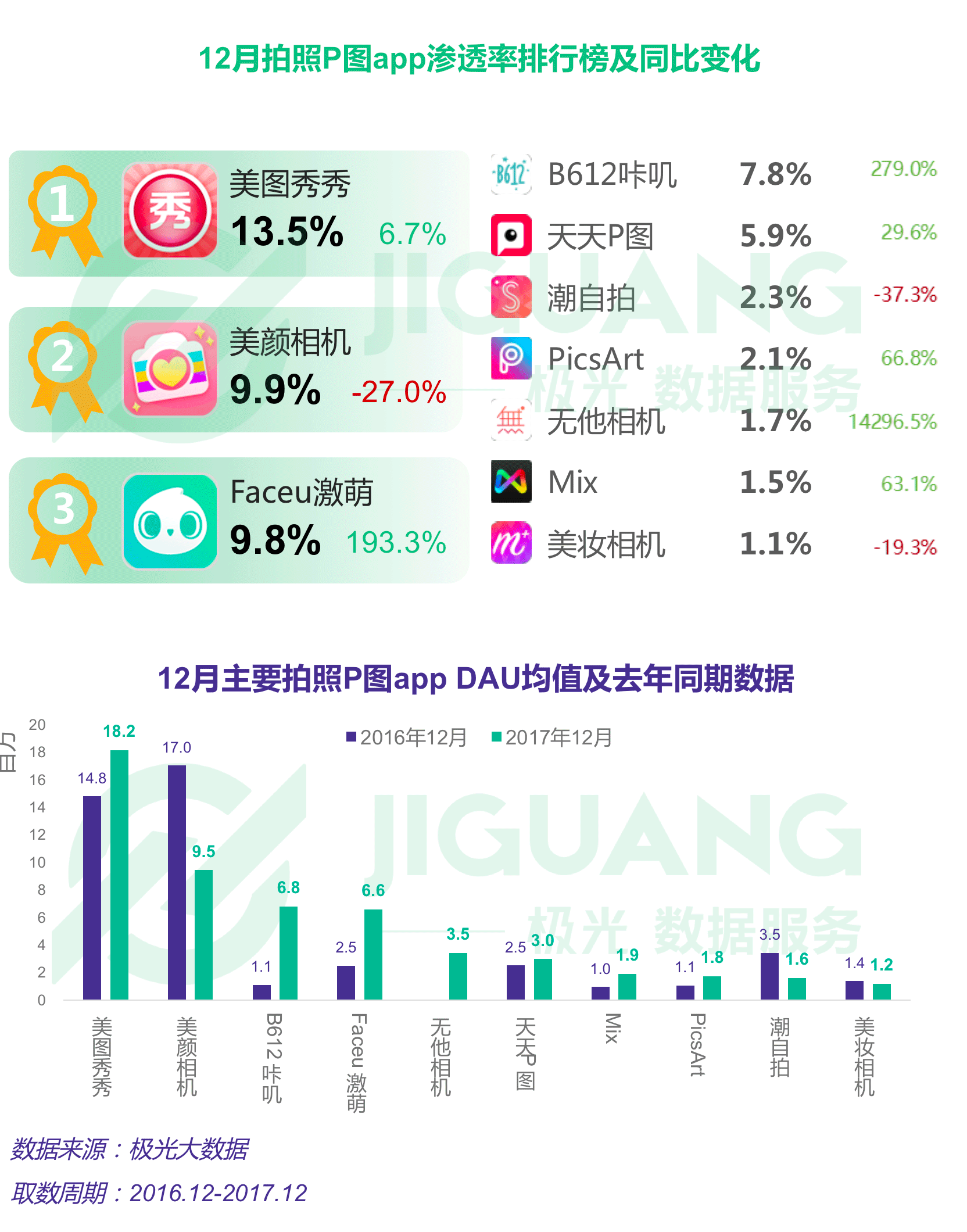 - 美颜相机渗透率与DAU均大幅下跌,Faceu激萌和B612咔叽则增长迅速