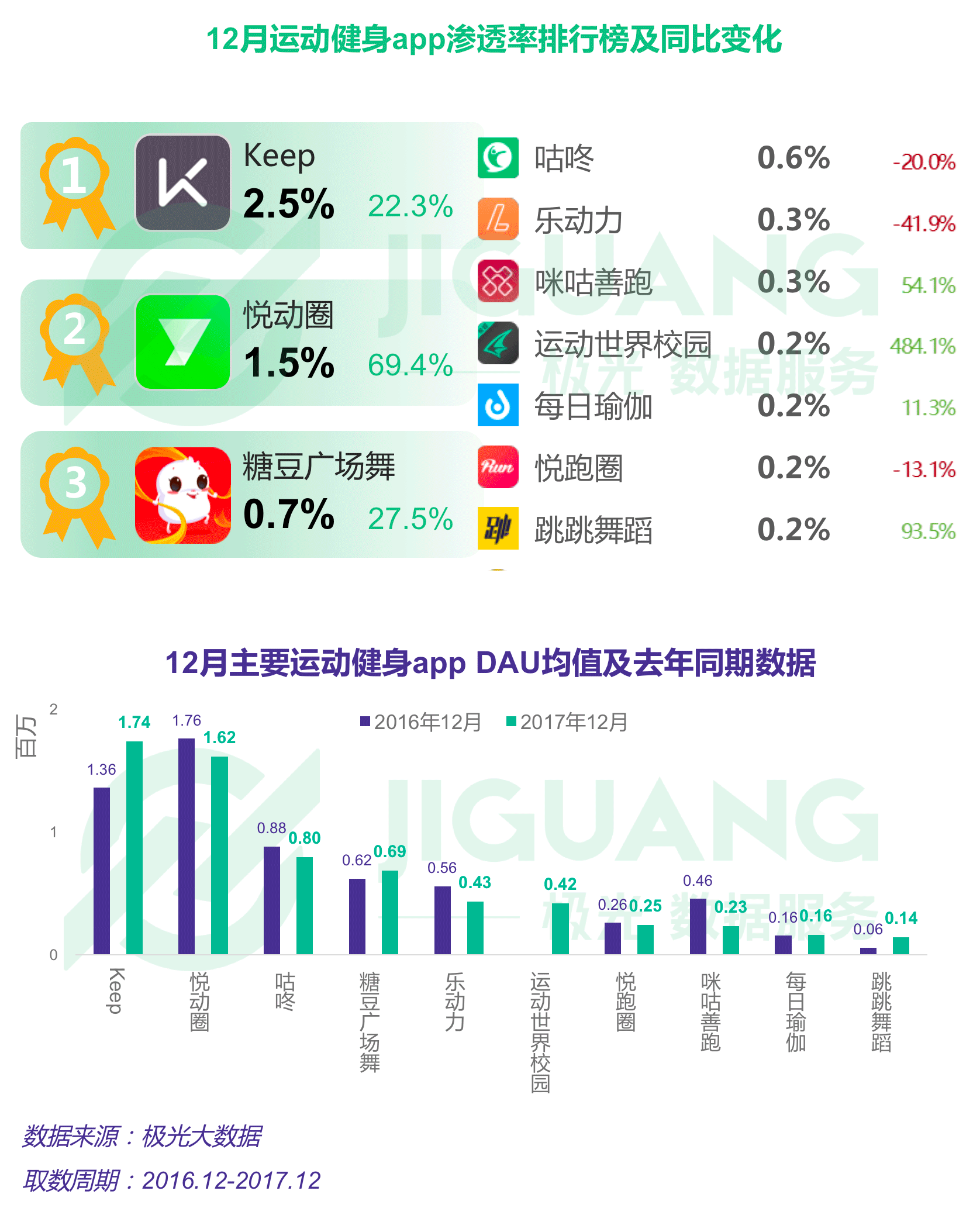 - 12月DAU均值排名top3的运动健身app :Keep、悦动圈、咕咚