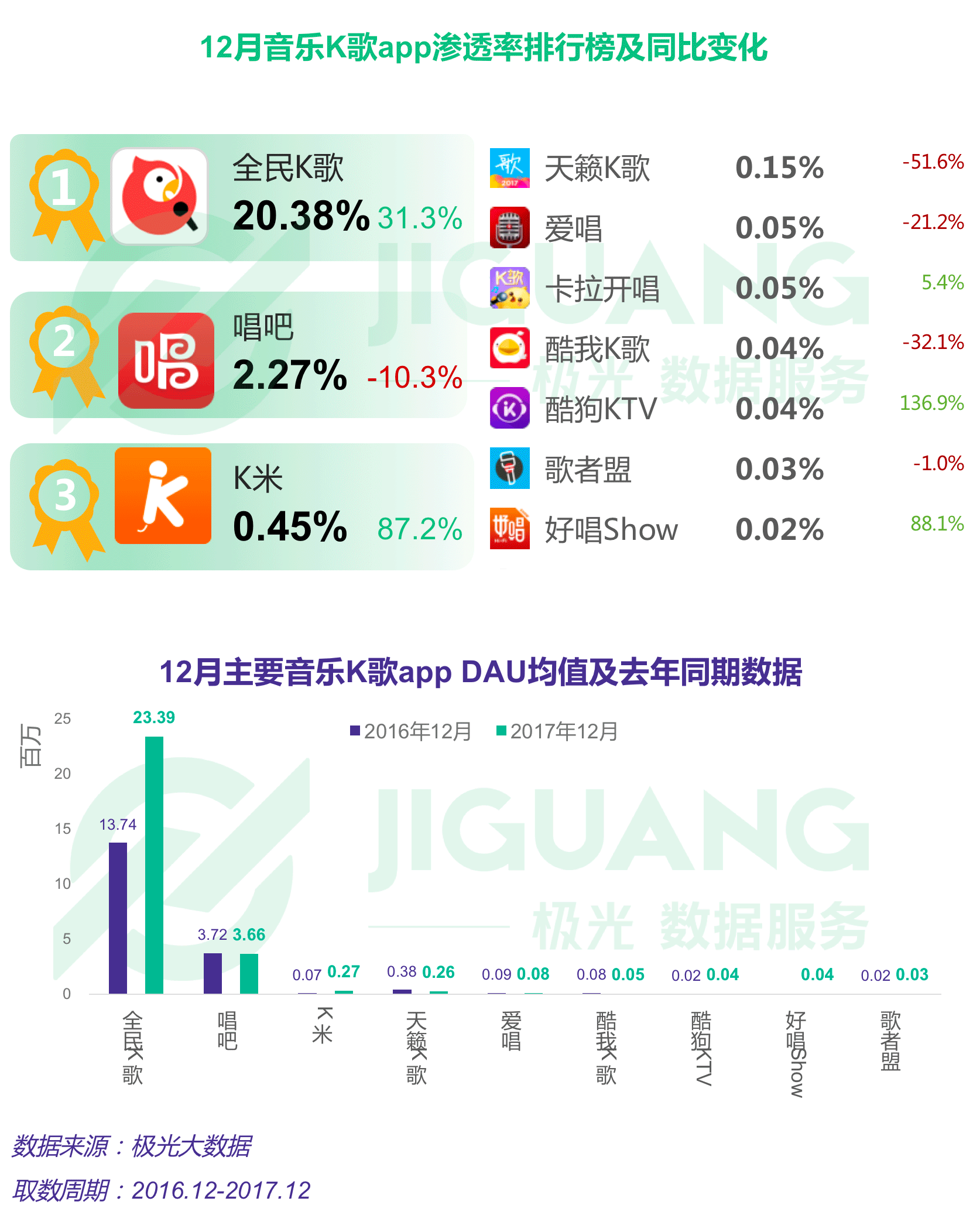 - 全民K歌的市场渗透率高达20.38%,意味着每100个中国移动网民中有超过20个人都安装了全民K歌,此外,12月平均每天有接近2340万人使用了它