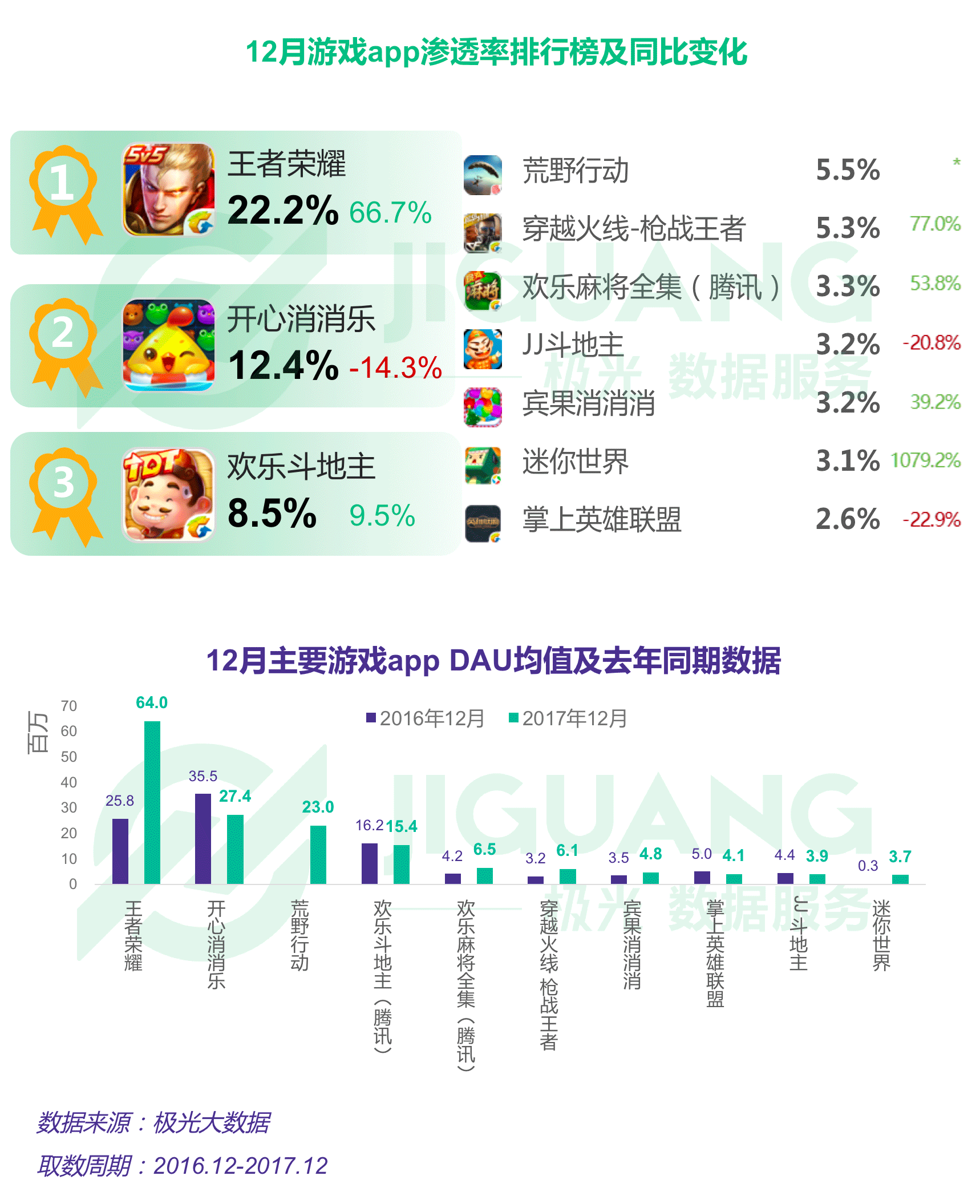 - 王者荣耀、开心消消乐和欢乐斗地主是手游渗透率top3,上线仅4个月的荒野行动位列第四