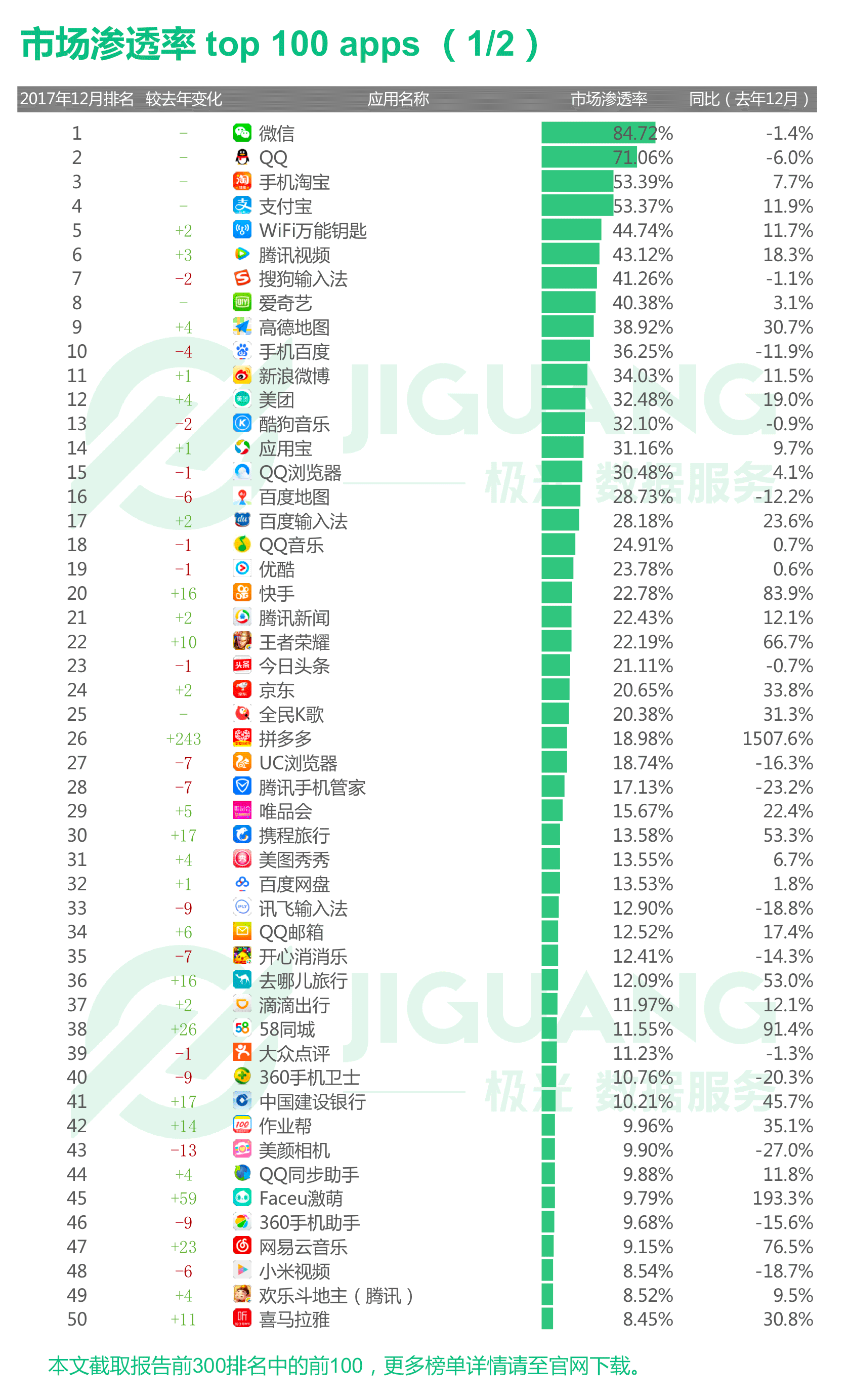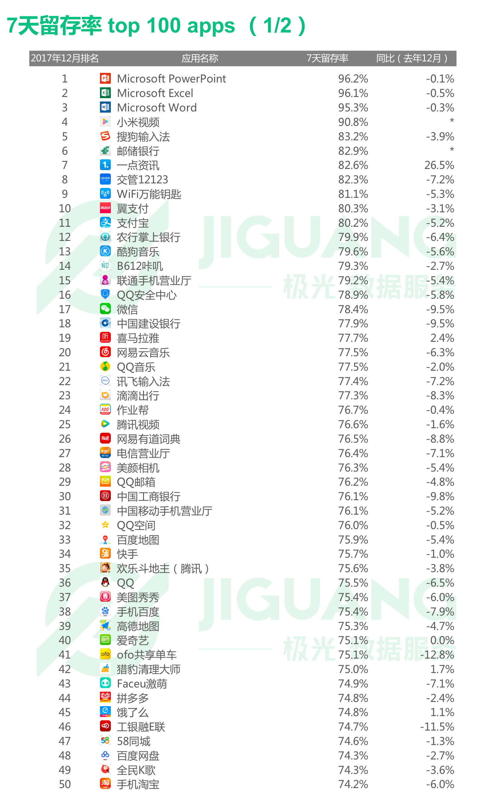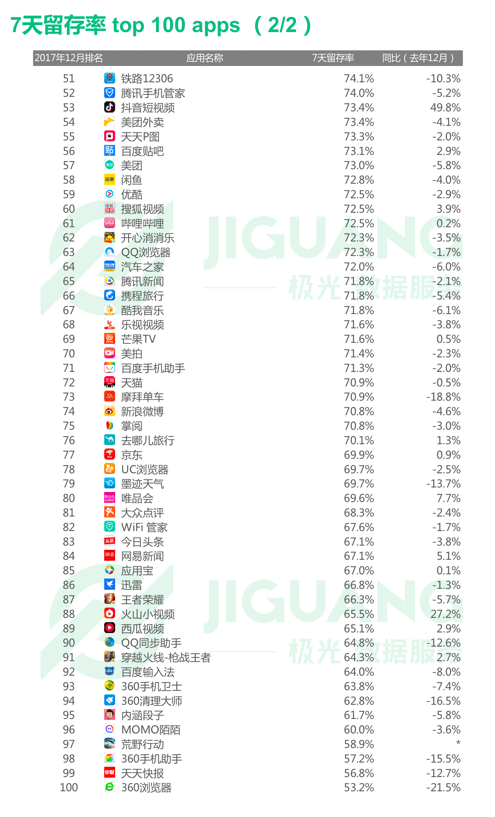 - 极光大数据显示,12月市场渗透率排名top100的app7天留存率均在50%以上,意味着至少有一半的新增用户在安装的一周后仍保留了该款app