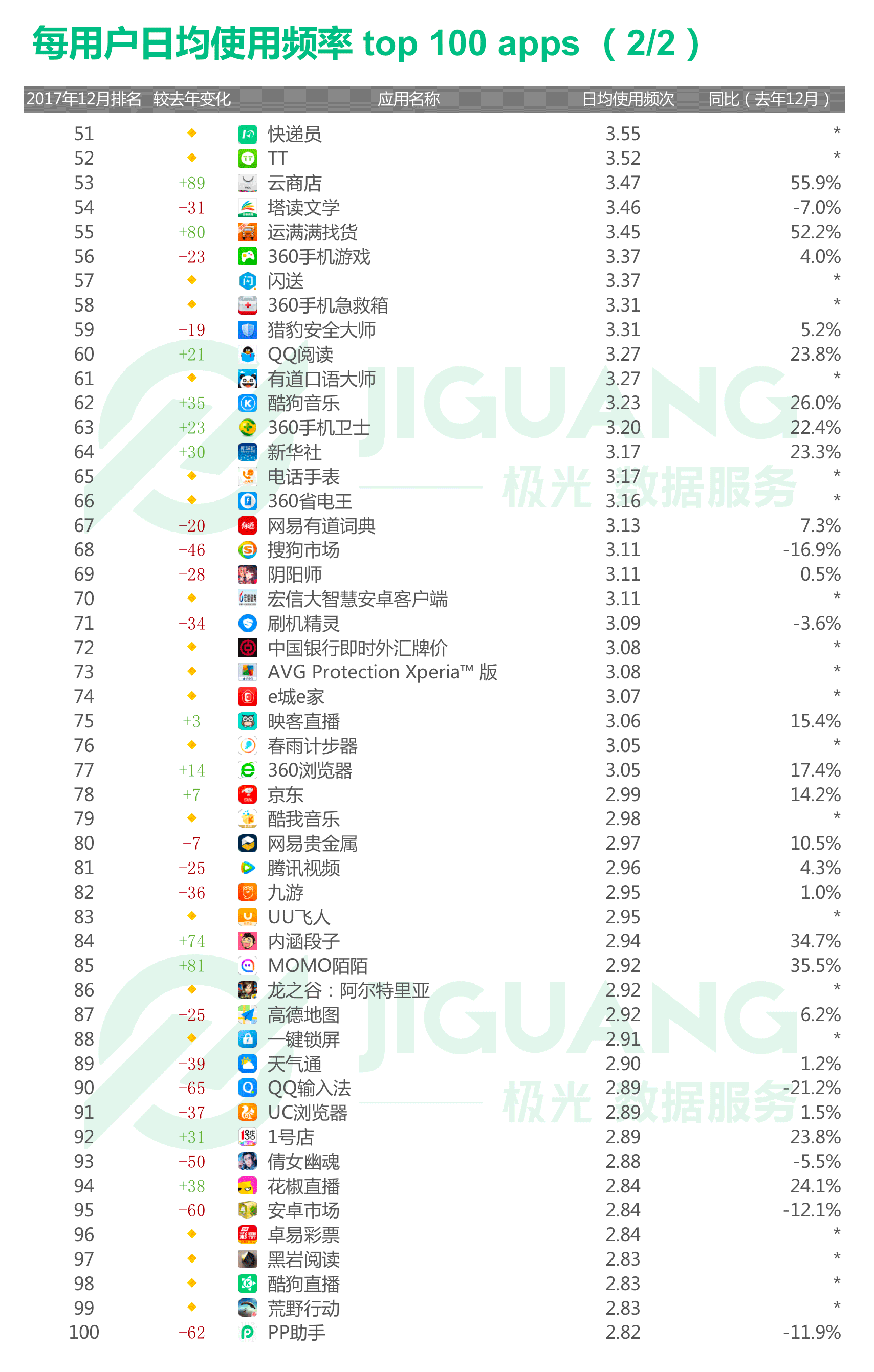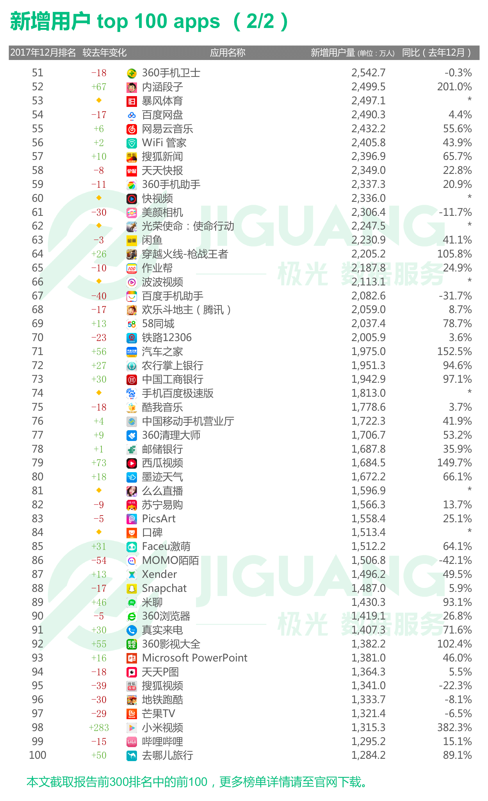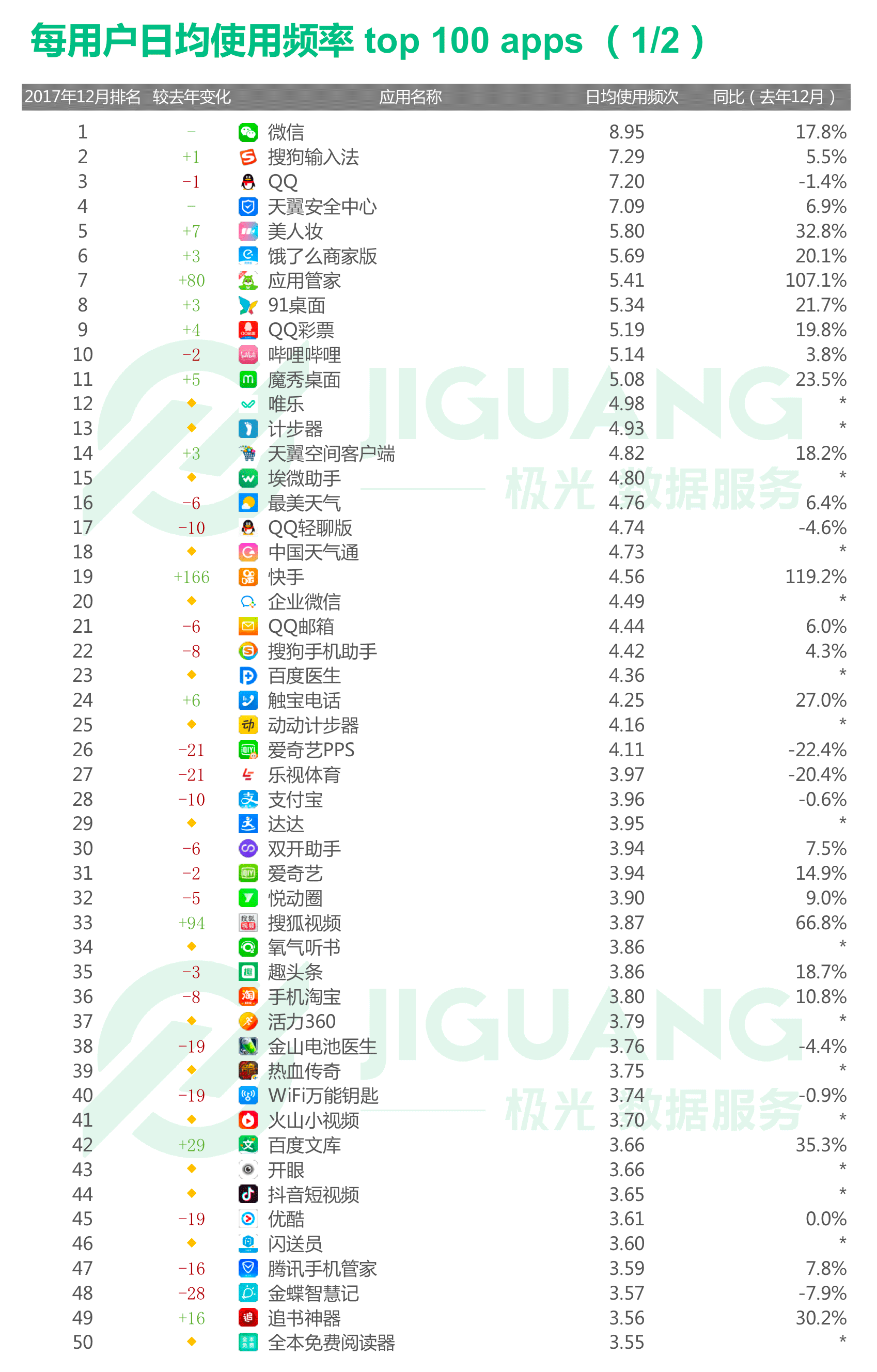 - 极光大数据显示,与去年同期相比,12月每用户日均使用频榜单新晋app有快手(19名,4.56次)、百度医生(23名,4.36次)、搜狐视频(33名,3.87次)等44款app