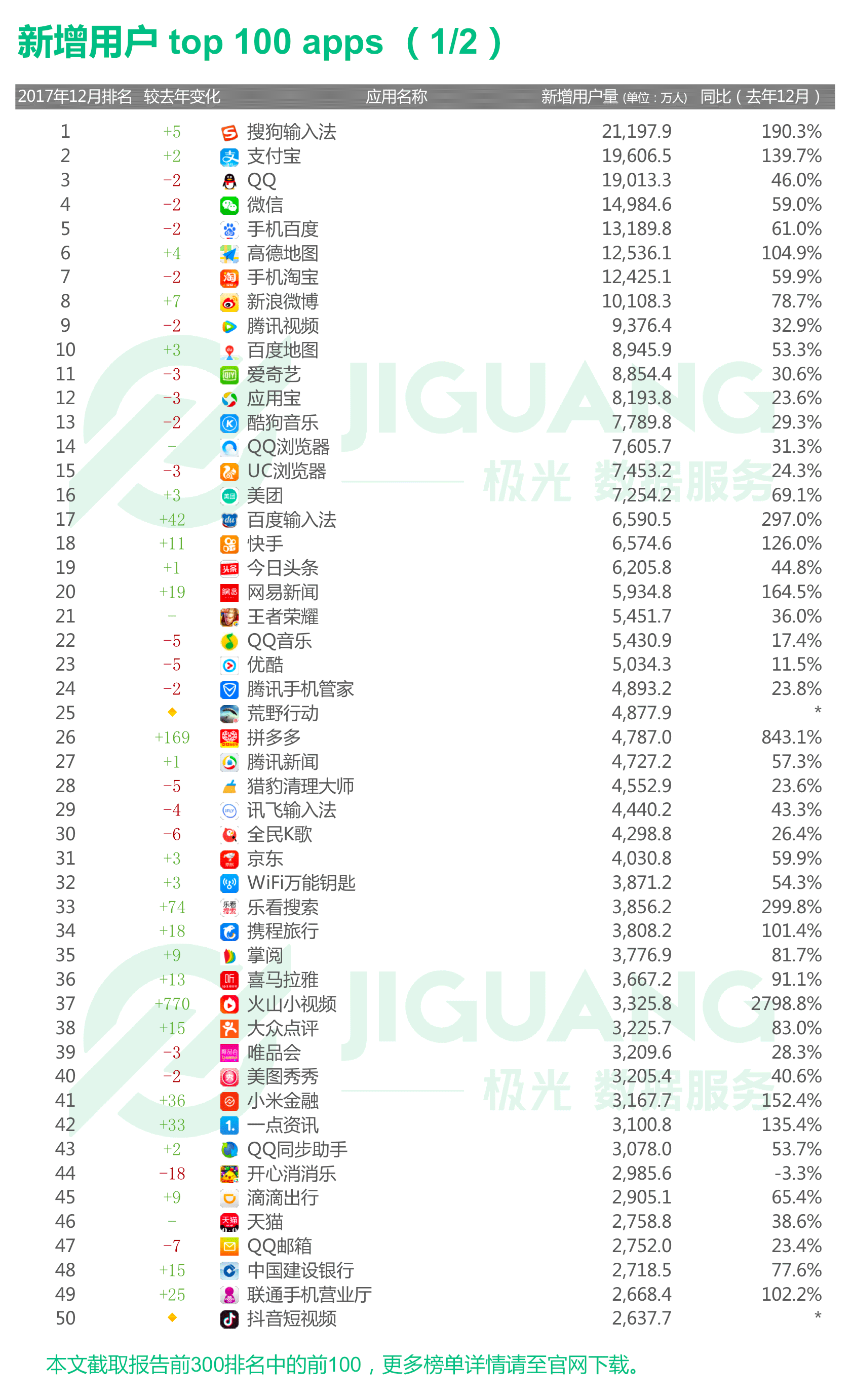 - 极光大数据显示,12月新增用户top 300榜单新晋app有荒野行动(25名,4877.9万)、火山小视频(37名,3325.8万)、抖音短视频(50名,2673.7万)等94款app