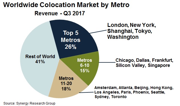 根据Synergy Research Group的新数据,全球前20个大都市占全球零售和批发托管收入的59%。