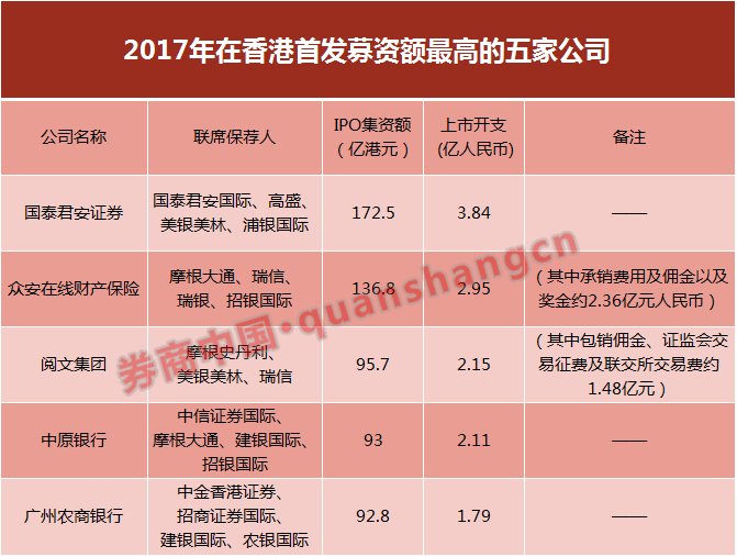 2017年,在港交所首次公开招股集资额前五位的分别是国泰君安、众安保险、阅文集团、中原银行和广州农商银行,集资额分别是172.5亿港元、136.8亿港元、95.7亿港元、93亿港元和92.8亿港元,共计590.8亿港元。其中,阅文集团认购阶段冻结资金达5200亿港元,创下2017年港交所IPO冻结资金最高纪录,更是港股史上第二多的冻资新股。