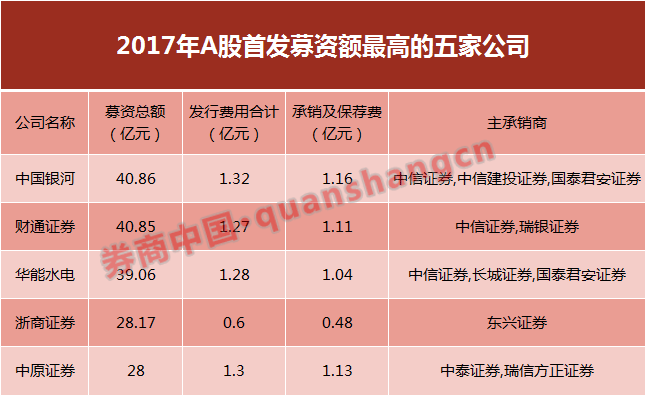 A股市场去年首次公开招股集资额前五位的分别是:中国银河证券、财通证券、华能水电、浙商证券和中原证券,集资额分别是40.86亿人民币、40.85亿人民币、39.06亿人民币、28.17亿人民币和28亿人民币,共计176.94亿人民币。