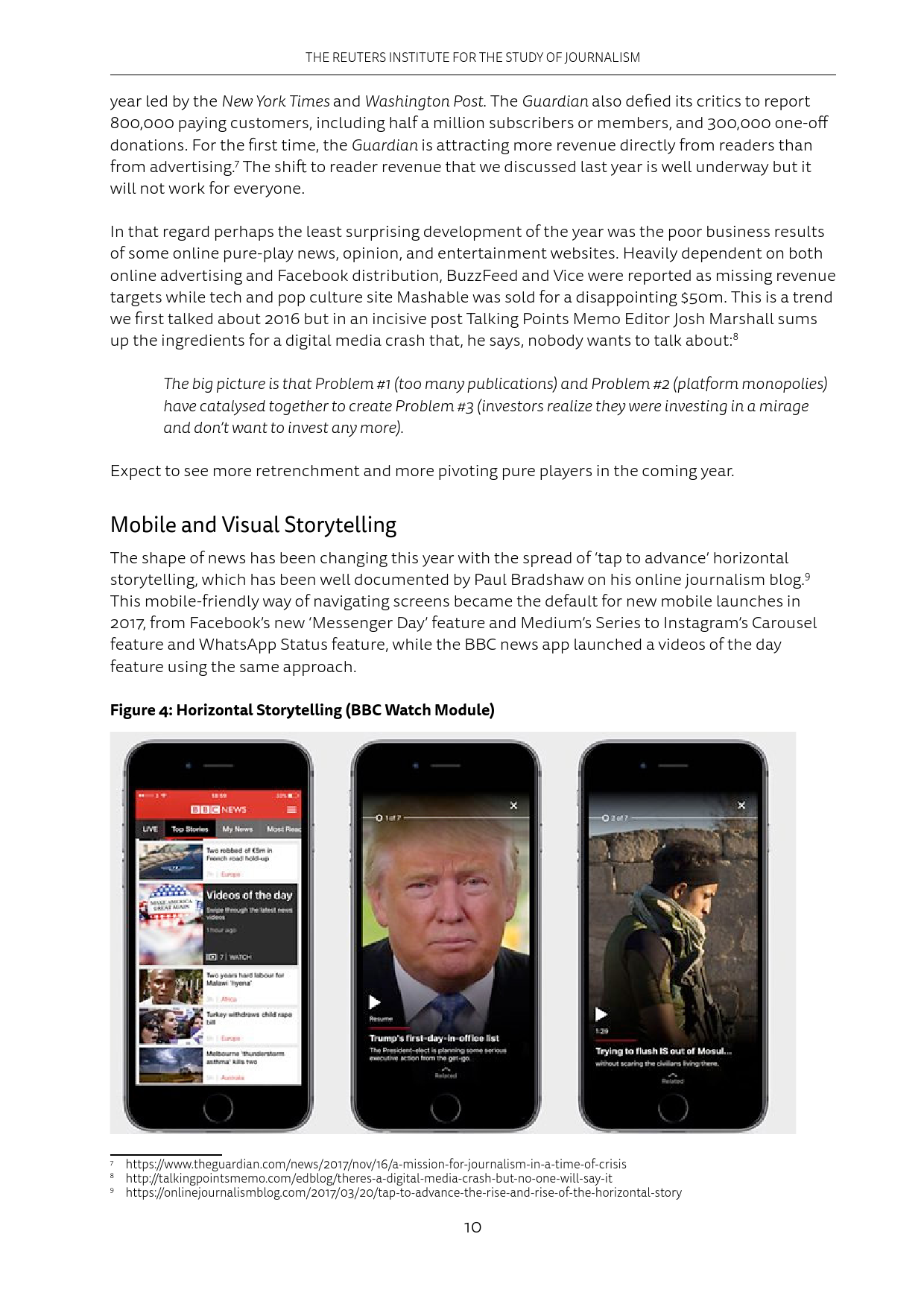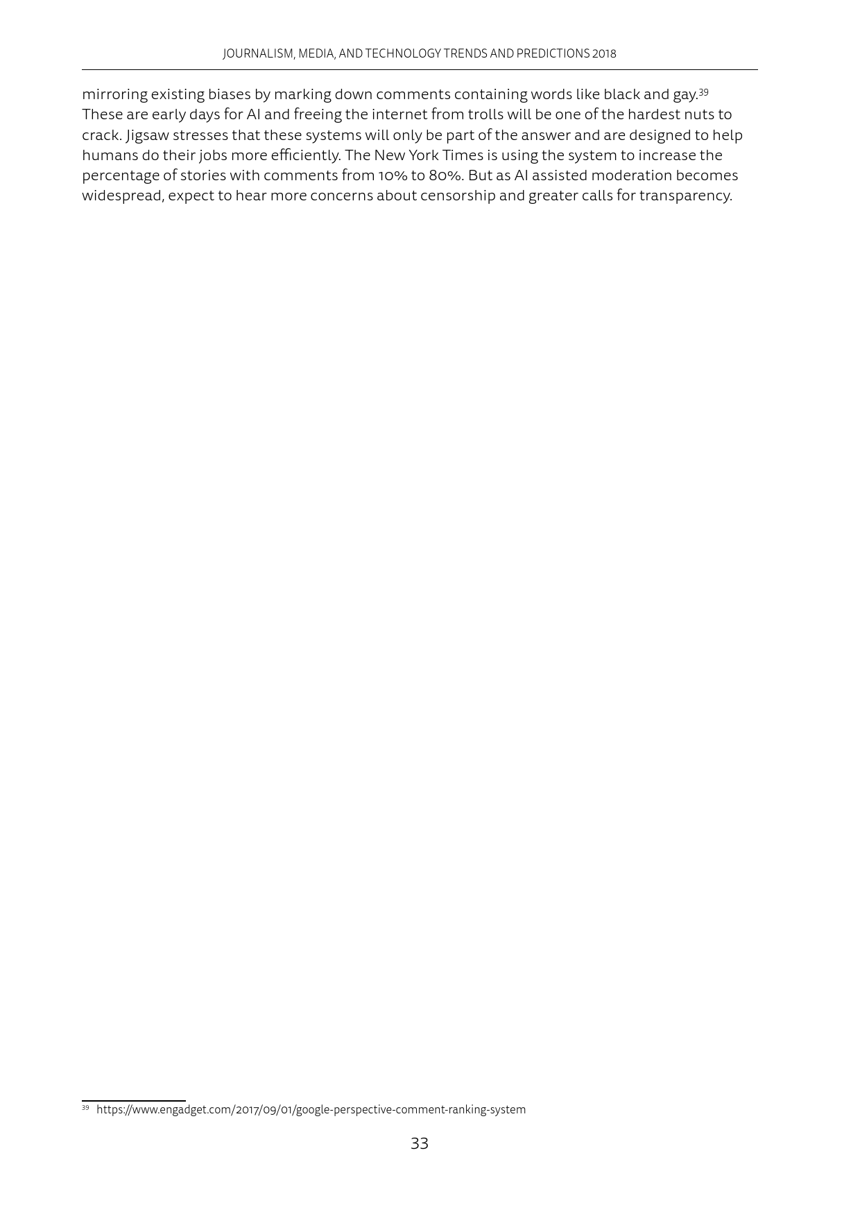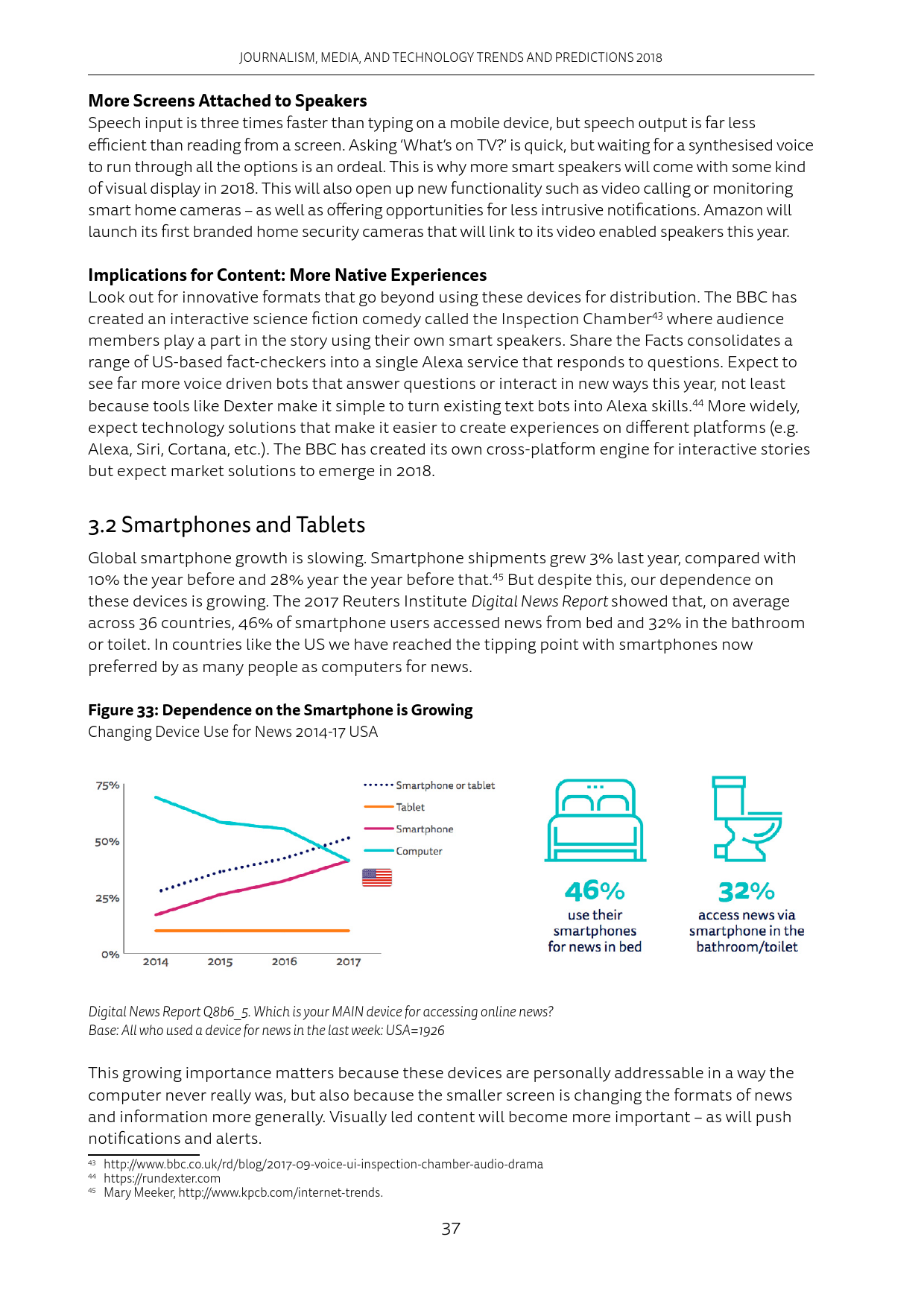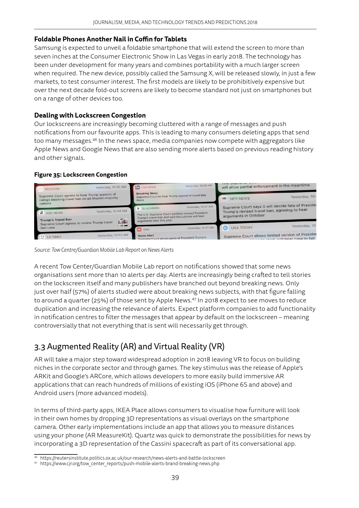 手机应用给用户推送的信息越来越多,这让很多人删除了推送消息过于频繁的应用程序。在新闻界,像Apple News和Google News这样的新闻聚合APP也发送了更多的消息提示。然而Apple News发送的消息提示里,只有约25%是重要新闻。2018年媒体会采取行动,在减少重复推送的同时,提升推送质量。此外,平台会增加过滤推送的功能。