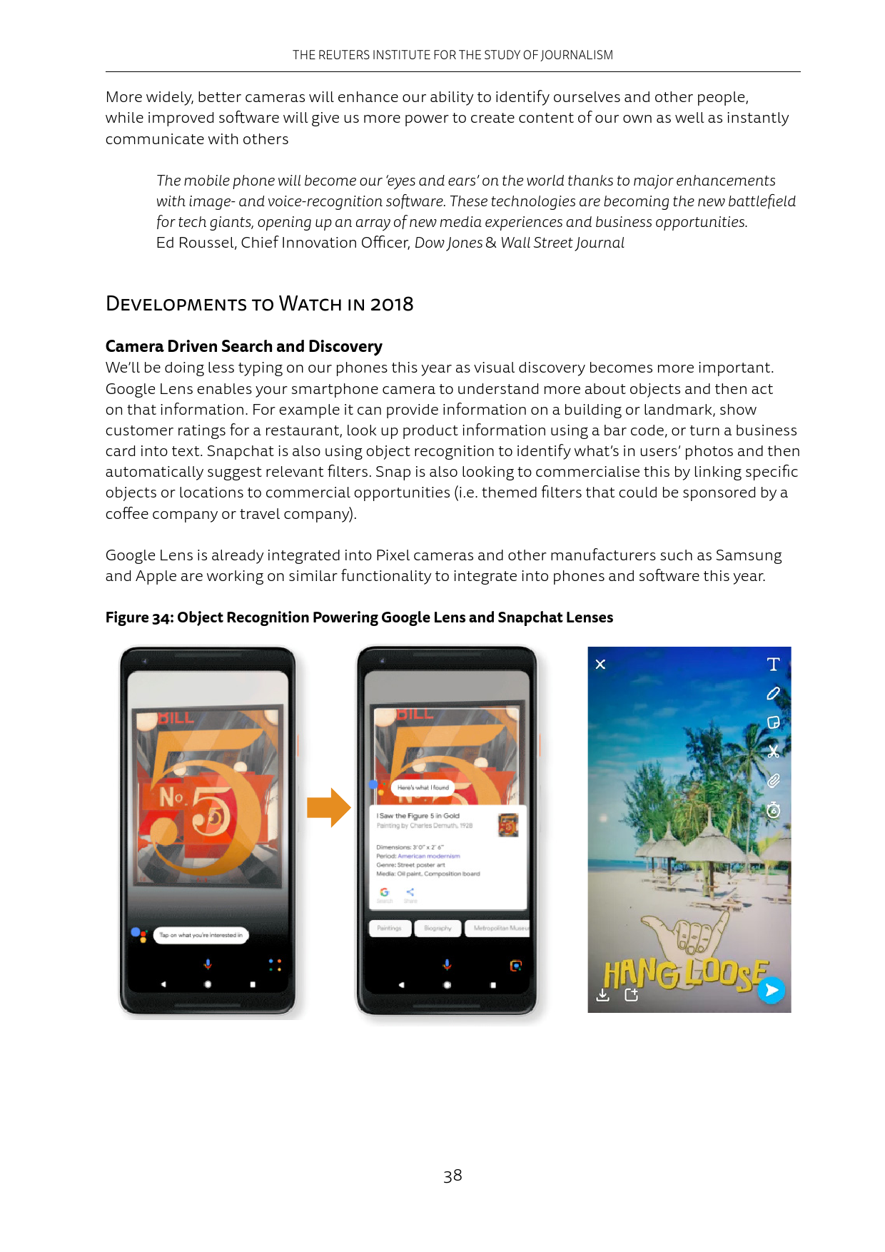 Google Lense可以让手机相机更好地识别拍摄内容并根据信息执行操作。Snapchat可以在识别照片内容后推荐相关滤镜。Google Lense已经可以在Pixel手机上直接使用,三星和苹果也在开发类似功能,计划今年亮相。