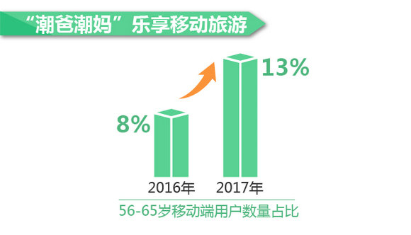 从移动端用户年龄分布情况来看,2017年,使用途牛旅游App的客户中,24-30岁的职场人士以及31-35岁的亲子家庭用户分别占比25%和26%。此外,从性别角度而言,女性用户占比达到72%。除了年轻人对移动互联网接受能力较强外,值得一提的是,56-65岁的用户使用手机下单的人次占比相较2016年上升了5%左右,越来越多的“潮爸潮妈”开始享受移动互联带来的乐趣。