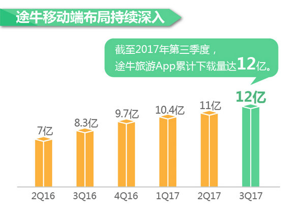 在移动互联网人口红利背景下,移动端成为途牛布局的重要方向。截至2017年第三季度,途牛旅游App累计下载量已达12亿,移动订单占在线总订单量的比例高达90%。
