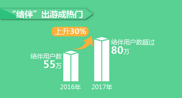 同时,通过途牛旅游App“结伴”功能“拼友”出游的用户也不在少数。途牛旅游网监测数据显示,2017年使用“结伴”功能的旅游者已突破80万大关,比2016年上升30%。80、90后用户是“拼友”出游的主力军,占比8成以上。
