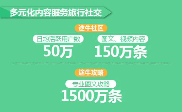 以目前人气较旺的“途牛社区”和“途牛攻略”为例,“途牛社区”采取UGC模式,日均活跃用户数超过50万,内容涵盖150万条图文、视频等多元化形态,用户的真实经验分享、口碑传播造就了社区的超高人气。“途牛攻略”采取PGC模式,1500万条专业图文攻略覆盖全球超百万的热门旅游目的地和景点,可以帮助用户更好地了解目的地以及制定出游计划。