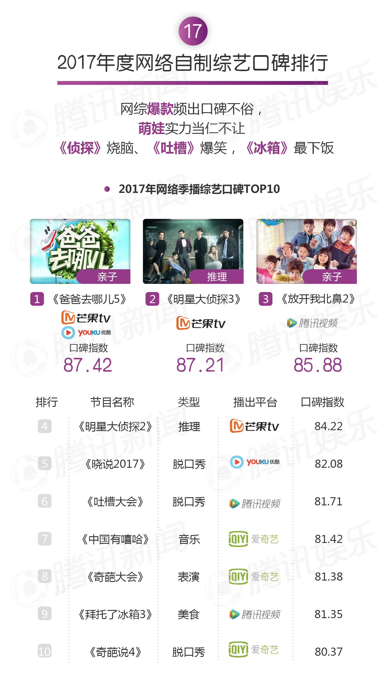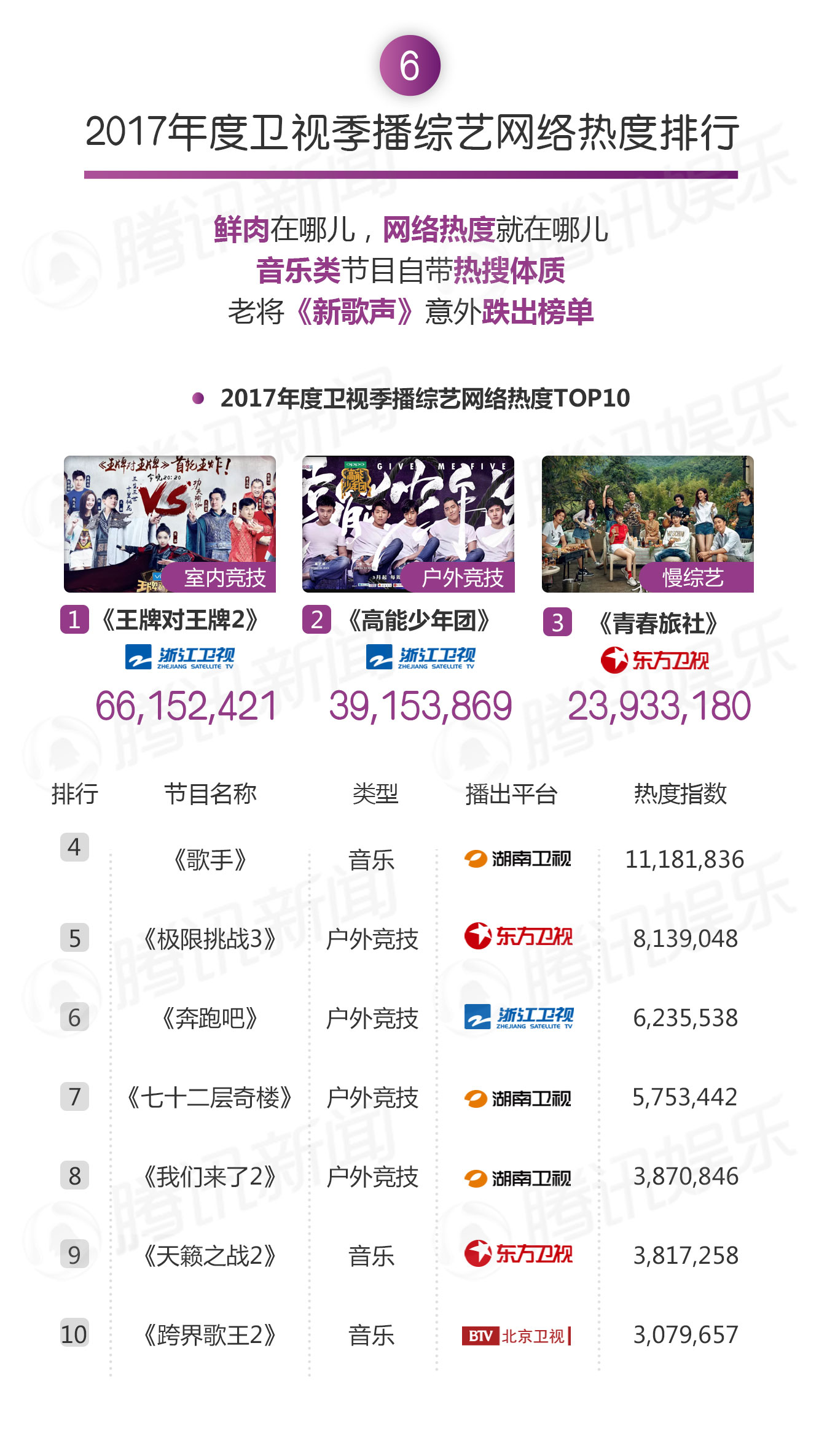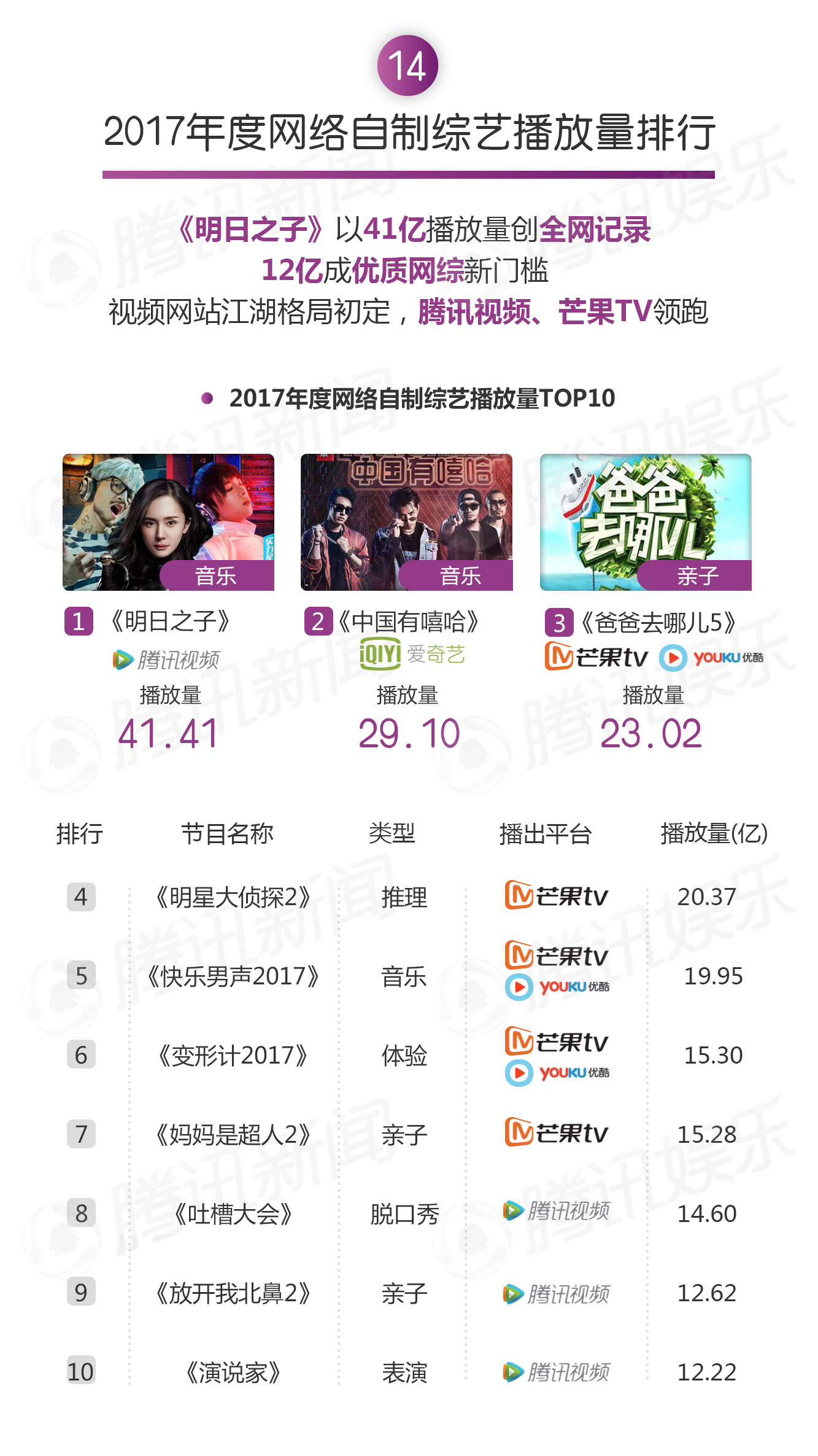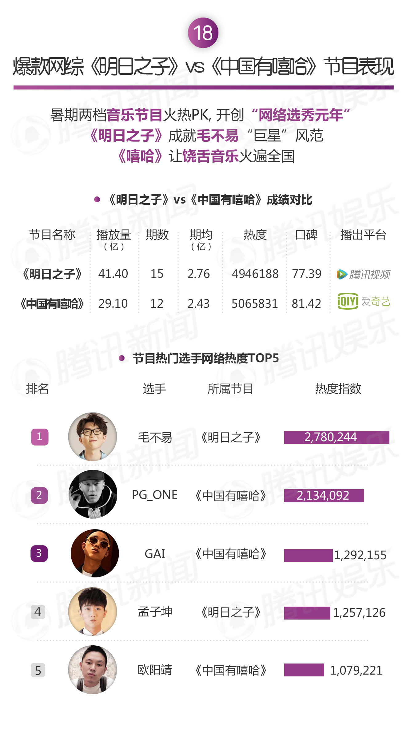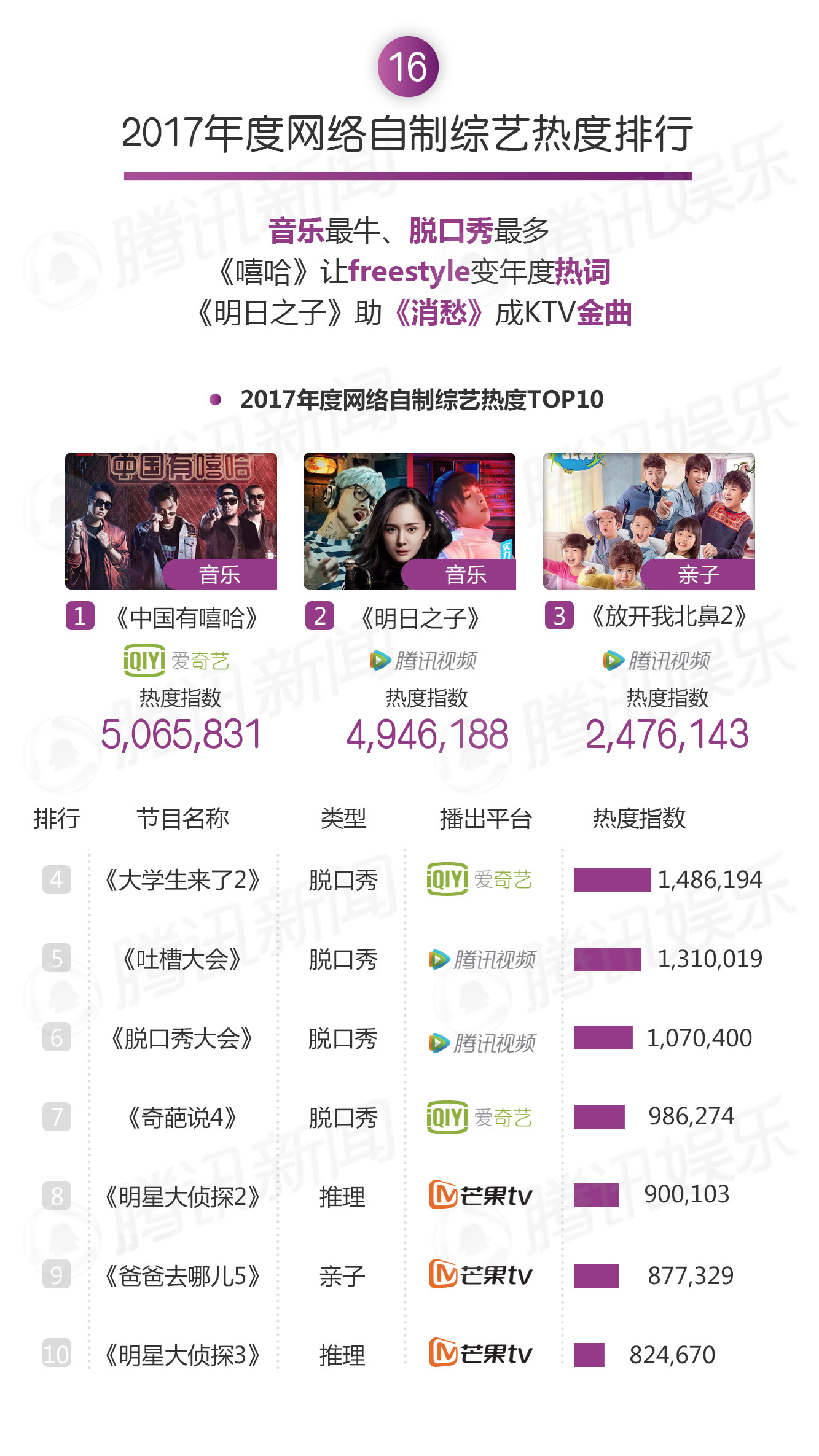 2017年的综艺市场,与变化一词拥抱得更紧。网综与卫视综艺之间的窗户纸终于捅破,并立刻彰显了自己的生命力:不过一年的时间,六大视频网站又增加了近三成的节目产量。爆款《中国有嘻哈》创造了大量年度热词,在2017年喊出了“中国嘻哈元年”的口号。多少音乐人前赴后继没完成的事,让一档网综实现了。而《明日之子》更是将网综的播放量纪录刷新到40亿以上,这个数据,足够跑进整个综艺节目排行榜的前五名。