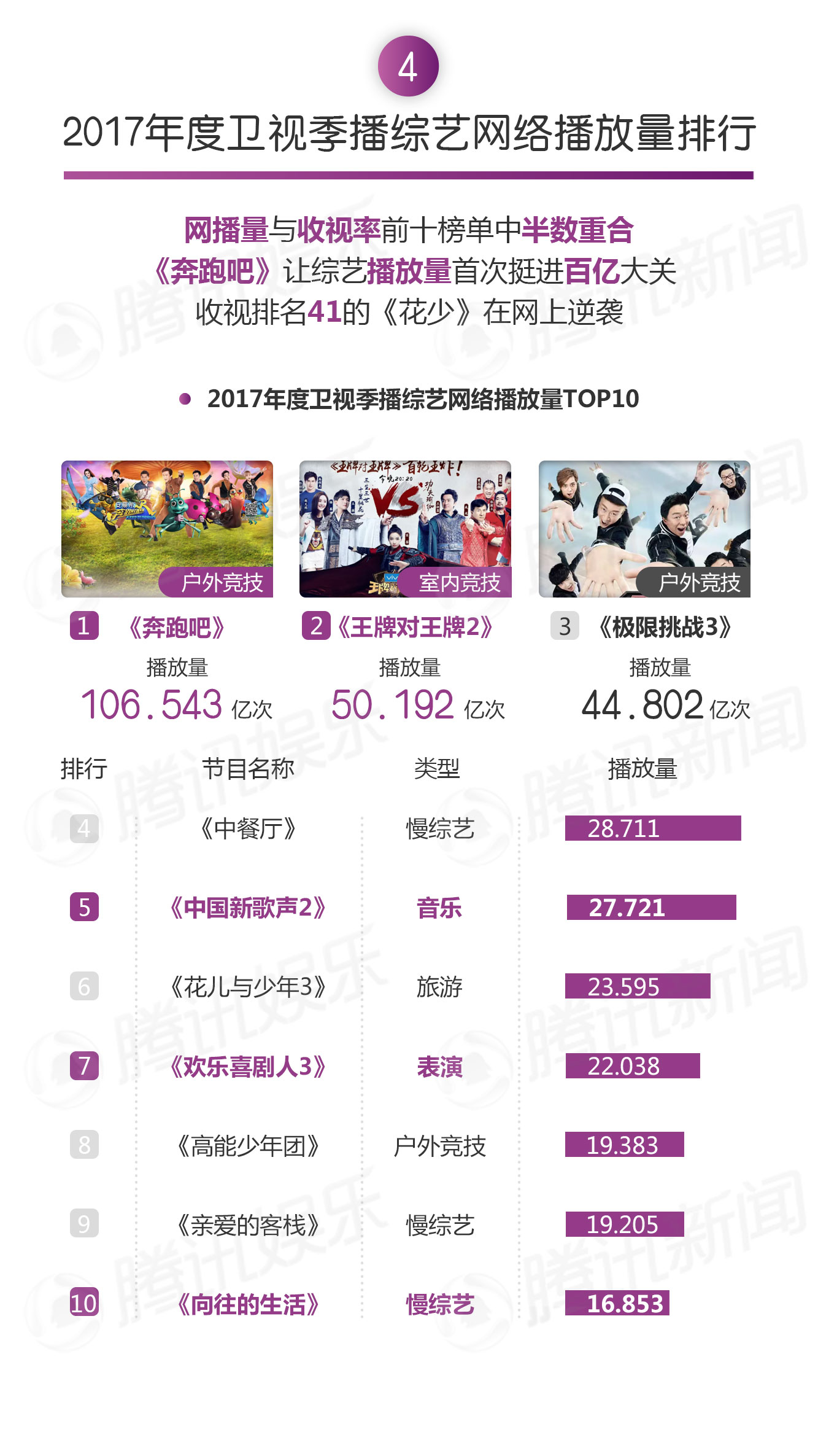 不但是网络自制节目的播放量在突围,视频网站作为播出平台,也在今年具有开创意义地分流走了大批的卫视综艺观众。这不光是一个感性认知,而是如实反映在了数据上。收视冠军《奔跑吧!兄弟》台播成绩仅为去年的70%,却在网络播放量中实现翻番,突破100亿!更多的人们开始在视频网站、甚至只在视频网站观看综艺节目。