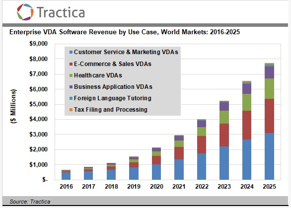 根据Tractica的最新数据,在未来几年,企业VDA的普及率将迅速增长,2017年全球1.452亿用户,到2025年将超过10亿活跃用户。届时全球企业VDA市场规模将达到77亿美元。
