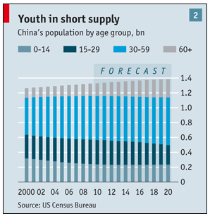 图中展现了劳动人口的老龄化趋势。一方面,这会造成劳动力绝对数量的减少;另一方面,劳动力的年龄结构也发生了变化,当那些主力军由二三十岁变成三四十岁时,他们由无牵无挂的单身汉变成了拖家带口的顶梁柱,由敢闯想拼的小伙子变成了追求安逸的中年人,其工资要求必然提高。这两方面的因素:供求的绝对变化,以及劳动力的心态转变,共同引发工资提高。