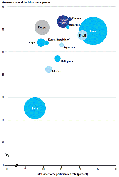 如下图所示,圆圈的大小代表劳动人口的多少,中国与印度最大。横轴是劳动参与率,中国最大,而印度最小。