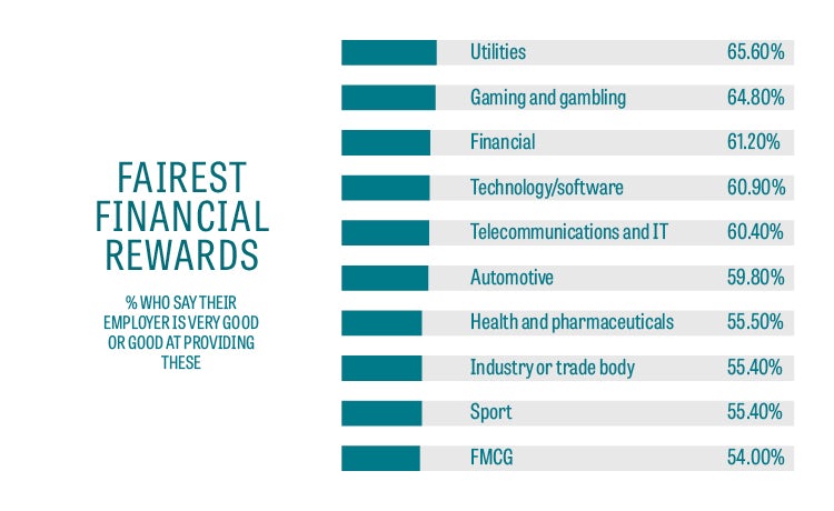 高收入和人们对薪酬公平的看法并不是一回事。在公共事业部门的营销人员中,65.6%认为雇主在提供公平的财务奖励方面做得相当好,其次是游戏和赌博(64.8%),以及金融业(61.2%)。