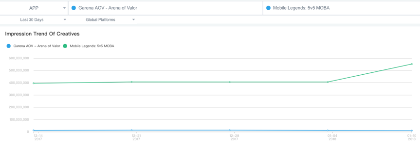数据图中,蓝、绿两色分别是《Mobile Legends》和《Arena of Valar》的广告展现量趋势。可以看到前者数据惊人,最高直奔7亿,后者则稳稳保持在九百万与一千万之间。