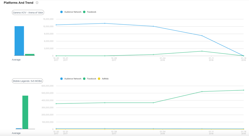 如上图,可以非常明显掌握这两款手游在投放渠道上的策略倾向:《Arena of Valar》的广告投放主阵地为Facebook,前期大量投到Audience Network中,后逐渐减少。《Mobile Legends》则多了一个AdMob渠道,并没有以Audience Network为重心,而是持续加大Facebook投放广告比例。由此联系到两者的最终广告展现量和营收效果,渠道的选择和分布策略是否可能起到了至关重要的影响?