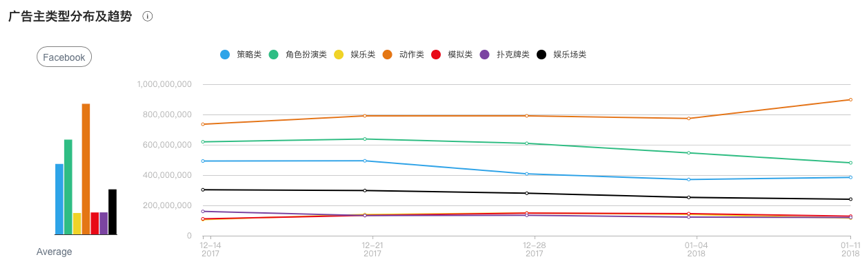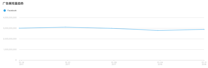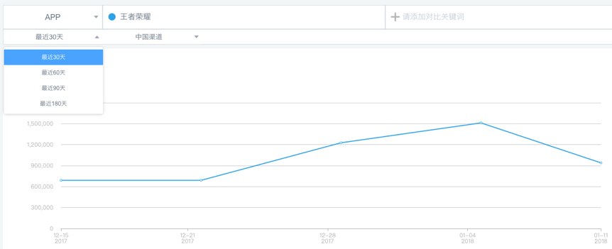 广告展现量趋势:APP、域名、卖家、搜索广告都可以通过此功能进行对比分析,根据需求选择 “近30天”“近60天”“近90天”“近180天”的时间跨度,和全球渠道、中国渠道、韩国渠道,或日本渠道的地域选择。下图为《王者荣耀》在中国渠道近30天的广告展现量表现,可以看到其展现量趋势一直在增长,在2018年1月5日开始转折,有所下降。