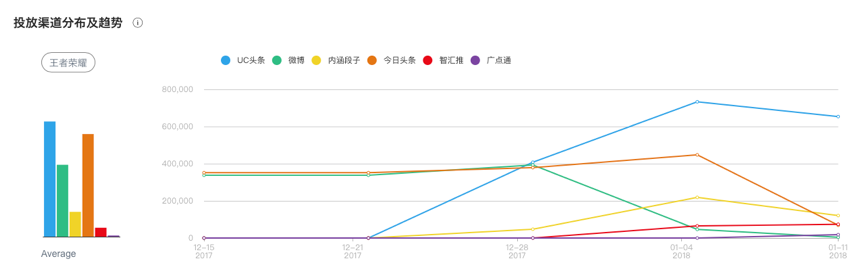 投放渠道分布及趋势:方便了解产品广告投放的所有选择渠道,以及它们在各个渠道的量级表现和分布趋势,更深一步掌握广告投放策略。如下图展示的是《王者荣耀》近半个月以来广告投放渠道分布及趋势,可以看到它从2017年12月22日开始投放UC头条并不断加大投放量,2018年1月4日左右所有渠道的投放量开始减少,尤其是今日头条表现最为明显。