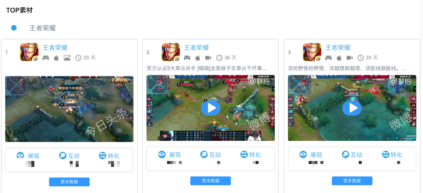 TOP素材:按照数据结果由高到低展示产品素材及其数据,便于广告主了解产品最热门广告的素材、内容、形式、文案、数据等相关详尽信息。在“更多”里可以直接进入该广告的落地页,了解它们的真实情况。