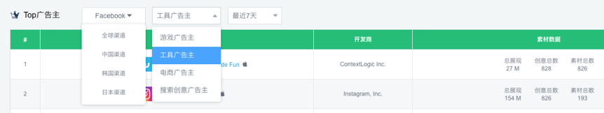 TOP广告主:方便了解每种渠道、类型的头部广告主总展现、创意总数、素材总数的具体情况。
