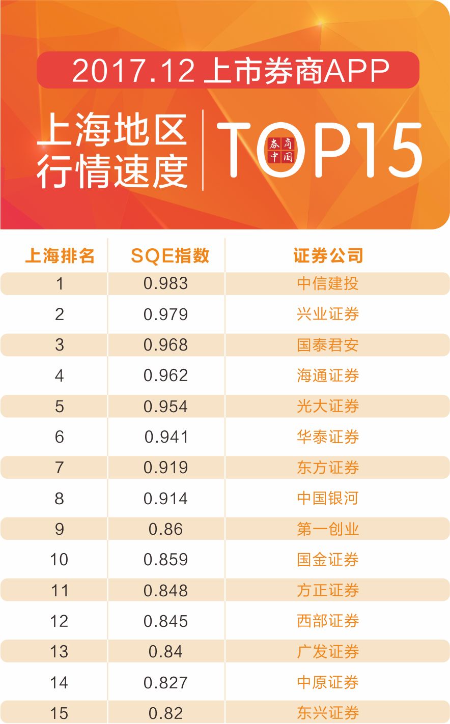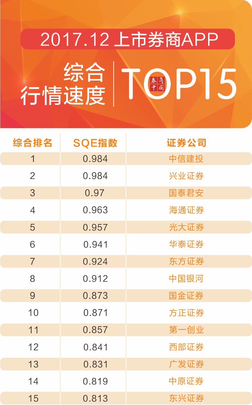 12月份的SQE综合指数显示,APP行情刷新速度排名第一位的是中信建投证券和兴业证券(并列),其他入围上市券商排名前15位的还有国泰君安、海通证券、光大证券、华泰证券、东方证券、中国银河证券、国金证券、方正证券、第一创业证券、西部证券、广发证券、中原证券以及东兴证券。具体排名如下: