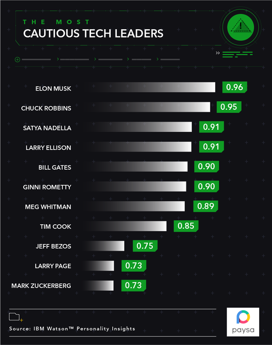 CNBC表示,在分析硅谷CEO们的特点时,谨慎虽然并非最为重要的品德之一,但也被科技大佬们所看重。Paysa称,IBM沃森的个性洞察API将CEO的谨慎程度按照0-1分进行打分。最低分0分为最不谨慎,最高分1分为最谨慎。