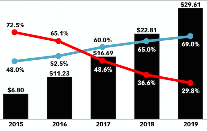 意料之中的是,BAT——百度、阿里巴巴和腾讯——将为最大一部分程序化支出买单。报告还指出,智能手机在中国的普及率将继续推动程序化支出, 2019年总支出将达到296.1亿美元(占数字展示广告总总支出的69%)。