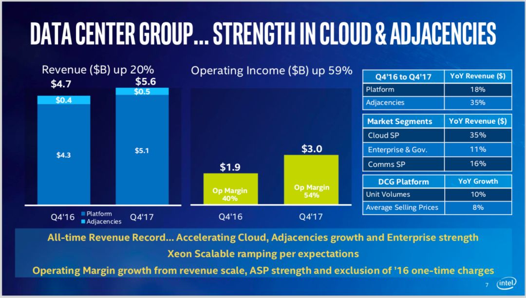 英特尔这家PC电脑的芯片巨人,虽然错过了手机时代,但其在数据中心和物联网领域的布局正在日渐成形。根据英特尔发布的4Q17财报,英特尔总营收同比增长4%,扣除掉Mcafee的影响后,营收同比增长8%至171亿美元。营收获得如此增长主要得益于Intel 数据中心业务的高速增长,除去McAfee后,同比增长21%,占营收的比重已经上升至47%,其中DCG,IOTG,PSG三大业务板块均增长明显。