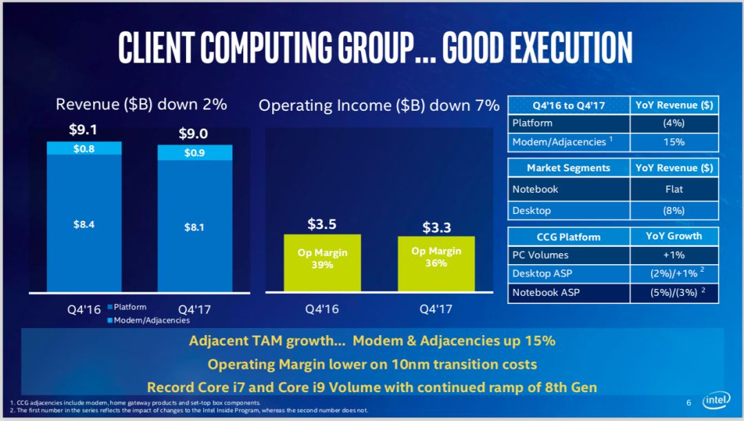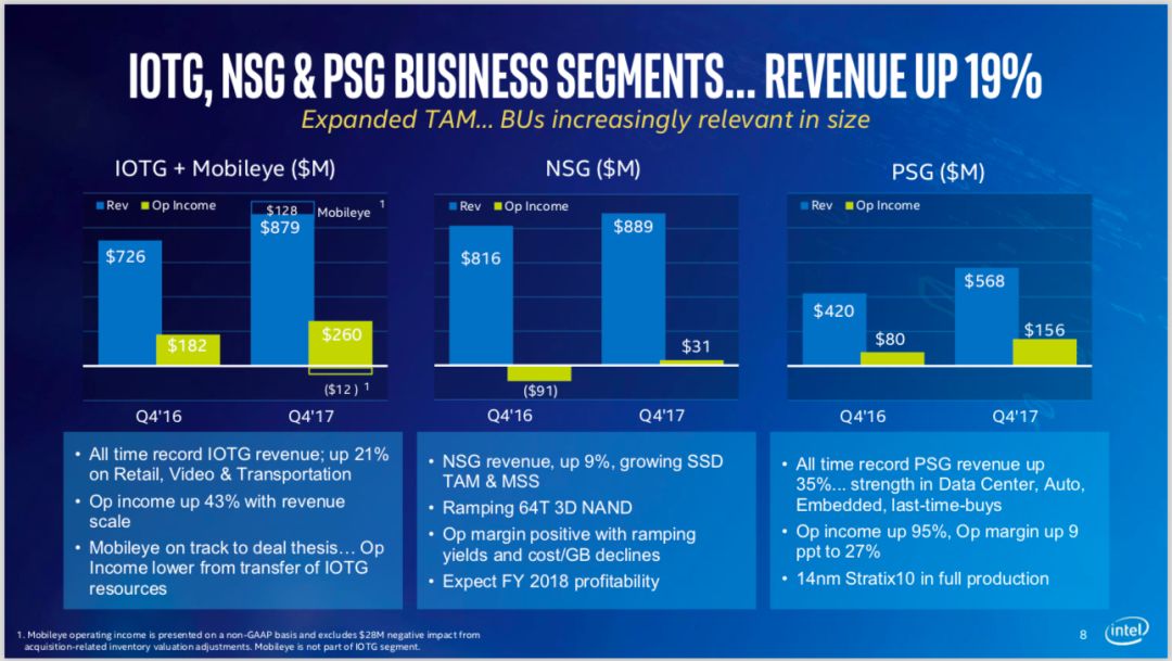 IOTG,NSG,PSG等业务单元,营收同比增长19%,利润均有明显增长。这些业务中包括了收购的智能汽车芯片业务Mobileye,以及英特尔的闪存业务。