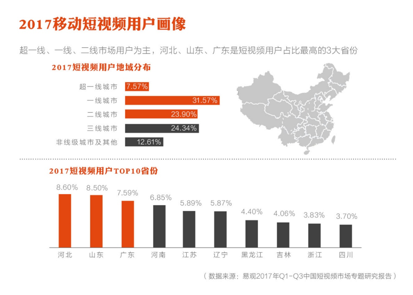 河北、山东、广东三大省份,取代了传说中的“东三省”,成为了短视频用户最多的省份,超一线、一线城市的短视频用户占比达到了39.14%。