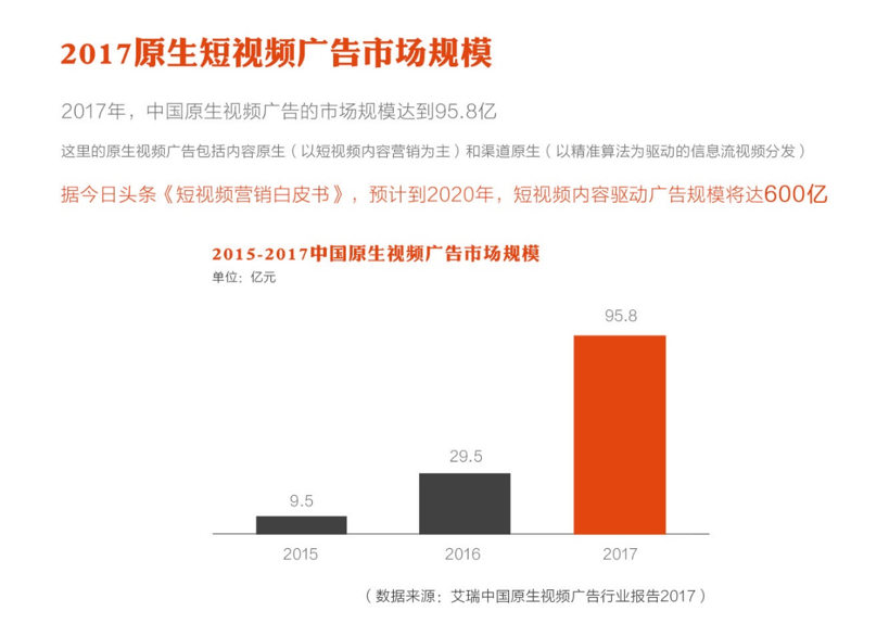 白皮书数据显示,2017年中国原生视频广告的市场规模达到了95.8亿,与过去两年相比,实现了几何级的增长。有机构预测,到2020年,短视频内容驱动的广告市场规模将达到600亿。