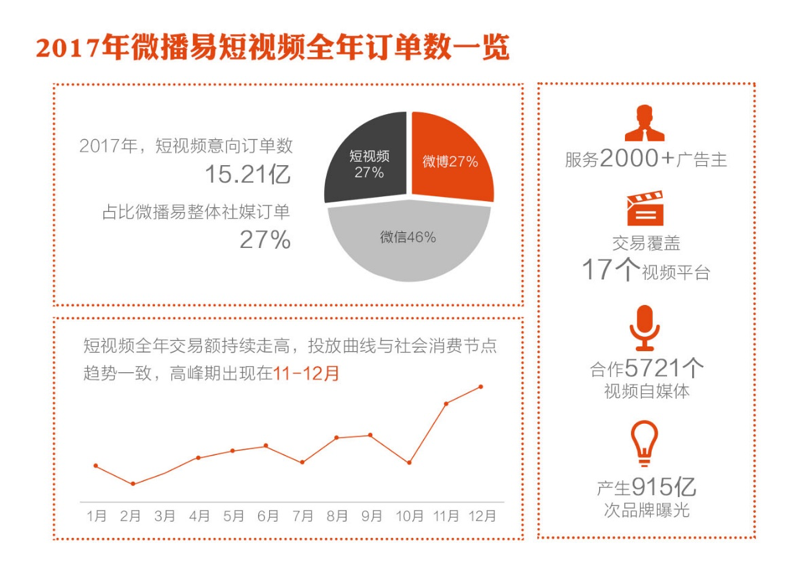 2017年,微播易共服务了2000+广告主,交易覆盖了17个视频平台,共合作了5721个视频自媒体,产生了915亿次品牌曝光。
