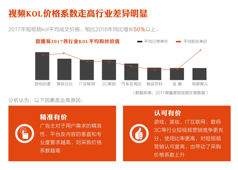 这种趋势下,短视频KOL的价格系数持续走高,广告主投放越多,竞争越充分,对用户要求越精准的行业,KOL的平均粉丝价值也越高。