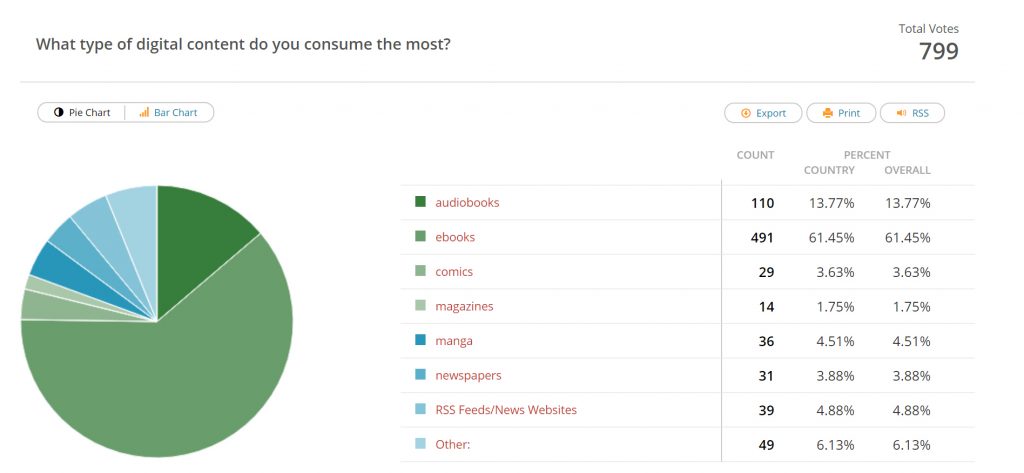有声读物以110票排在第二位,令人惊讶的是它击败了漫画(3.63%)、杂志(1.75%)、漫画(4.51%)和报纸(3.88%)。现在有声读物更容易获得,苹果和Audible不再是这个市场的唯一玩家。Kobo在去年年底推出了自己的有声读物商店,Google发布了与Android Auto、Google Home以及Google Books应用兼容的全新有声读物解决方案。