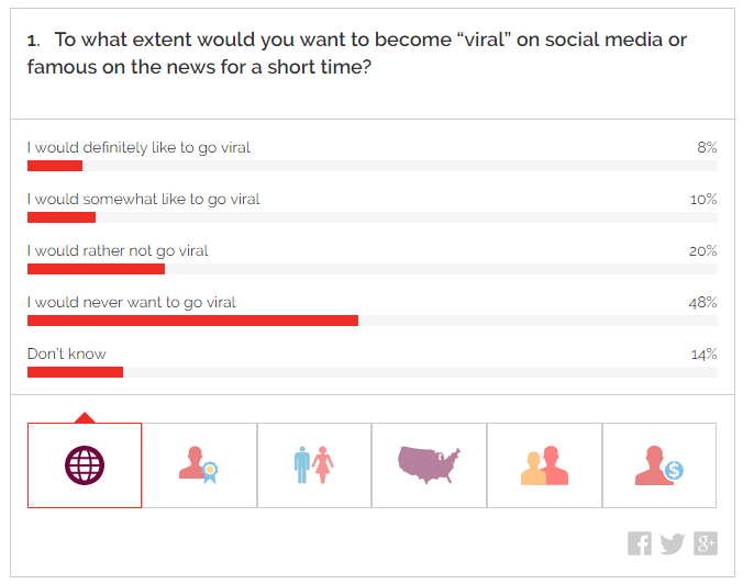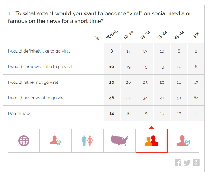 当问及是否想在社交媒体上成名时,只有18%的美国人表示愿意,将近一半受访者(48%)表示绝不会想要病毒式传播。最反对病毒式传播的是55岁以上的美国人,其中81%的人这么认为。这表明年纪越大越不希望在网上声名狼藉。