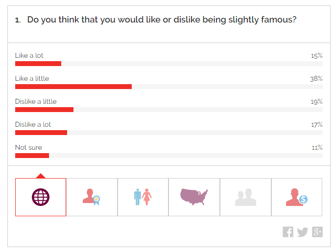 社交媒体和广泛分布的网络信息让一些美国人可以体验好莱坞明星或者富人的生活。有人可能还记得一个美国教授接收英国BBC远程采访的视频,因为他的孩子闯入直播画面,在Facebook上这个视频被观看了8400万次。在YouGov最新调查中,68%的美国人表示不喜欢病毒式传播。但那些想在短时间内成名的人,千禧一代占大多数。