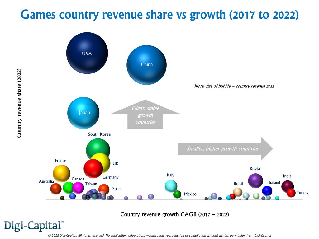 美国、中国、日本和韩国在未来五年内将占全球游戏市场的2/3。从地区来看,亚洲游戏市场超过北美和欧洲的总和。